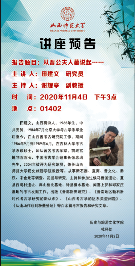 【预告】 山西省考古研究院田建文研究员应历史与旅游文化学院邀请来威尼斯官网作学术报告
