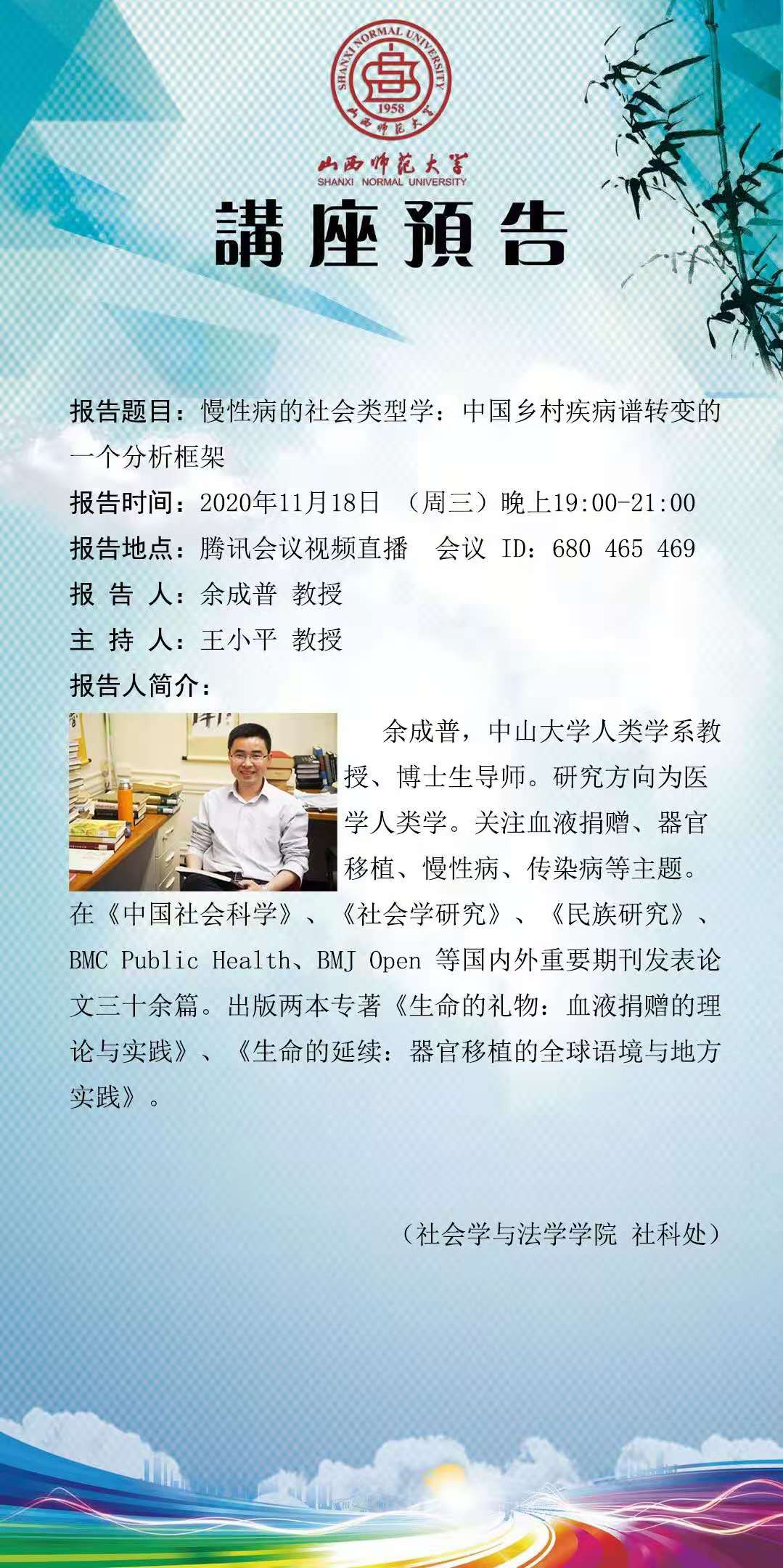 【预告】中山大学人类学系余成普教授应社会学与法学学院邀请作线上学术报告