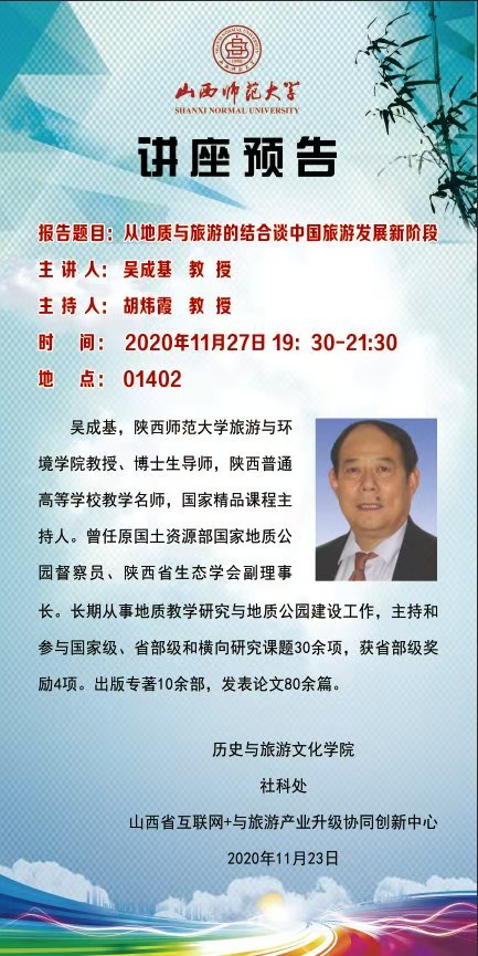 【预告】 陕西师范大学吴成基教授应历史与旅游文化学院邀请来威尼斯官网作学术报告