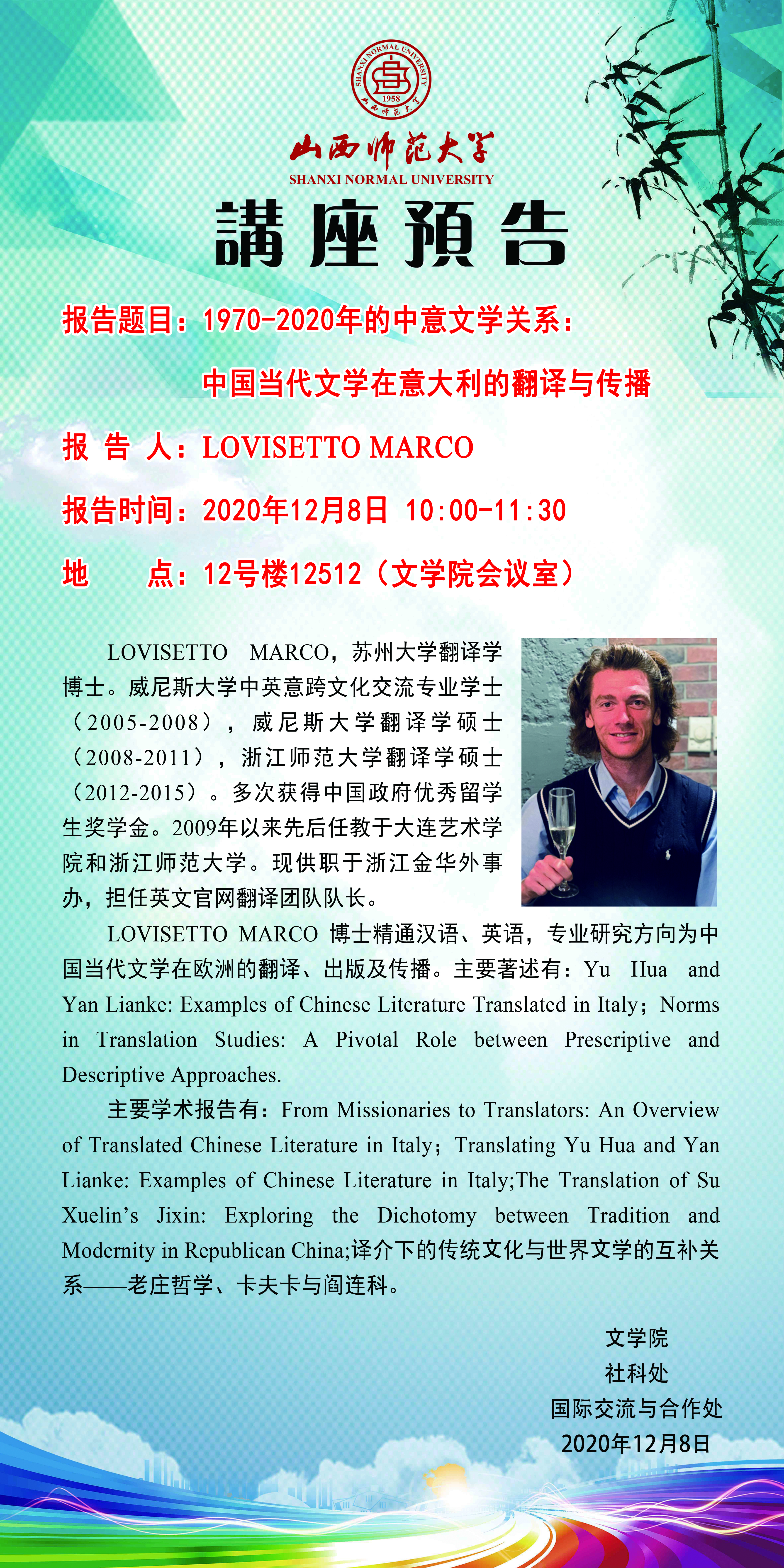 【预告】 苏州大学博士Marco Lovisetto应文学院邀请来威尼斯官网作学术报告