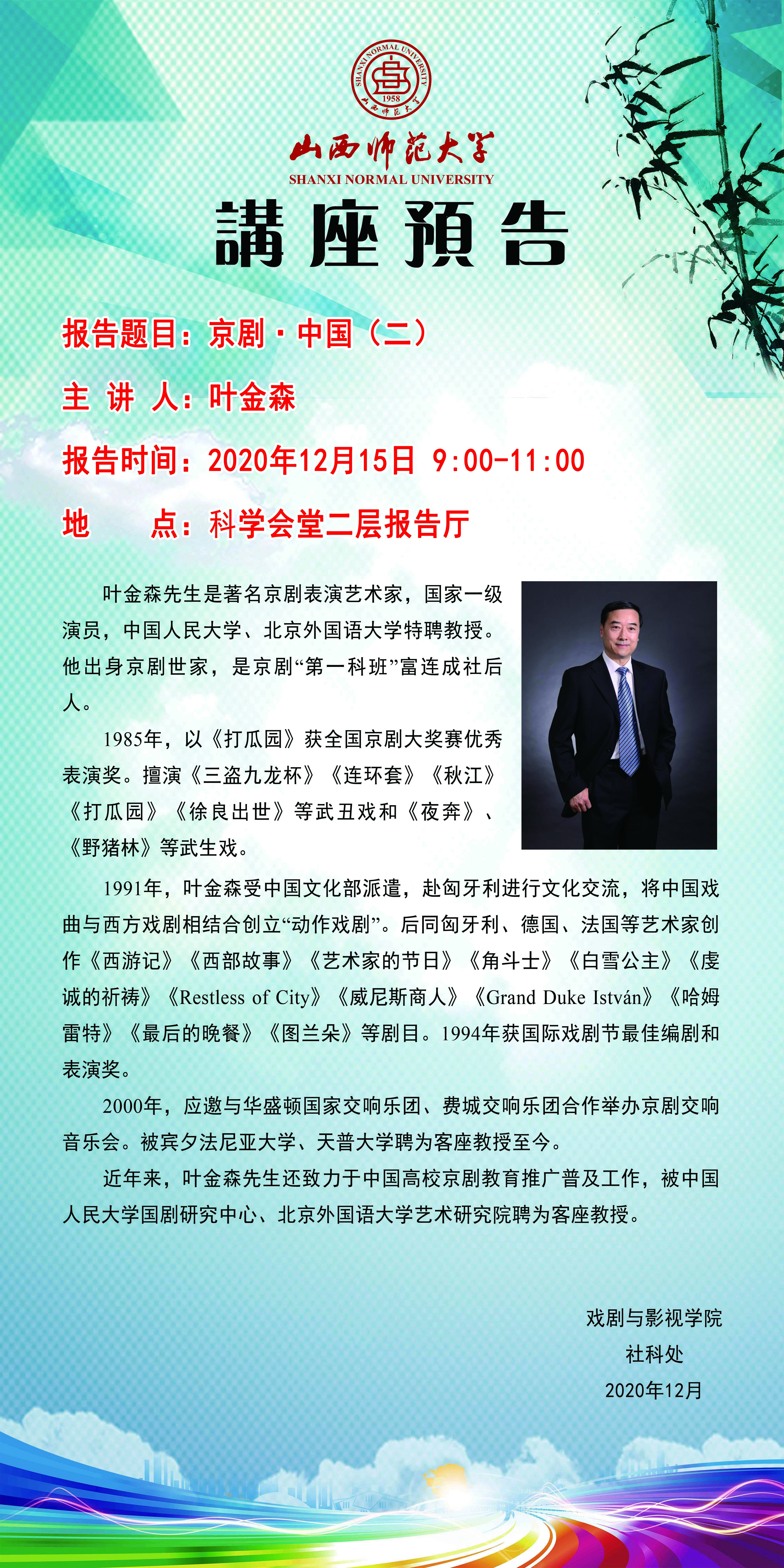 【预告】著名京剧表演艺术家、中国人民大学/北京外国语大学特聘教授叶金森先生应戏剧与影视学院邀请来威尼斯官网作学术报告