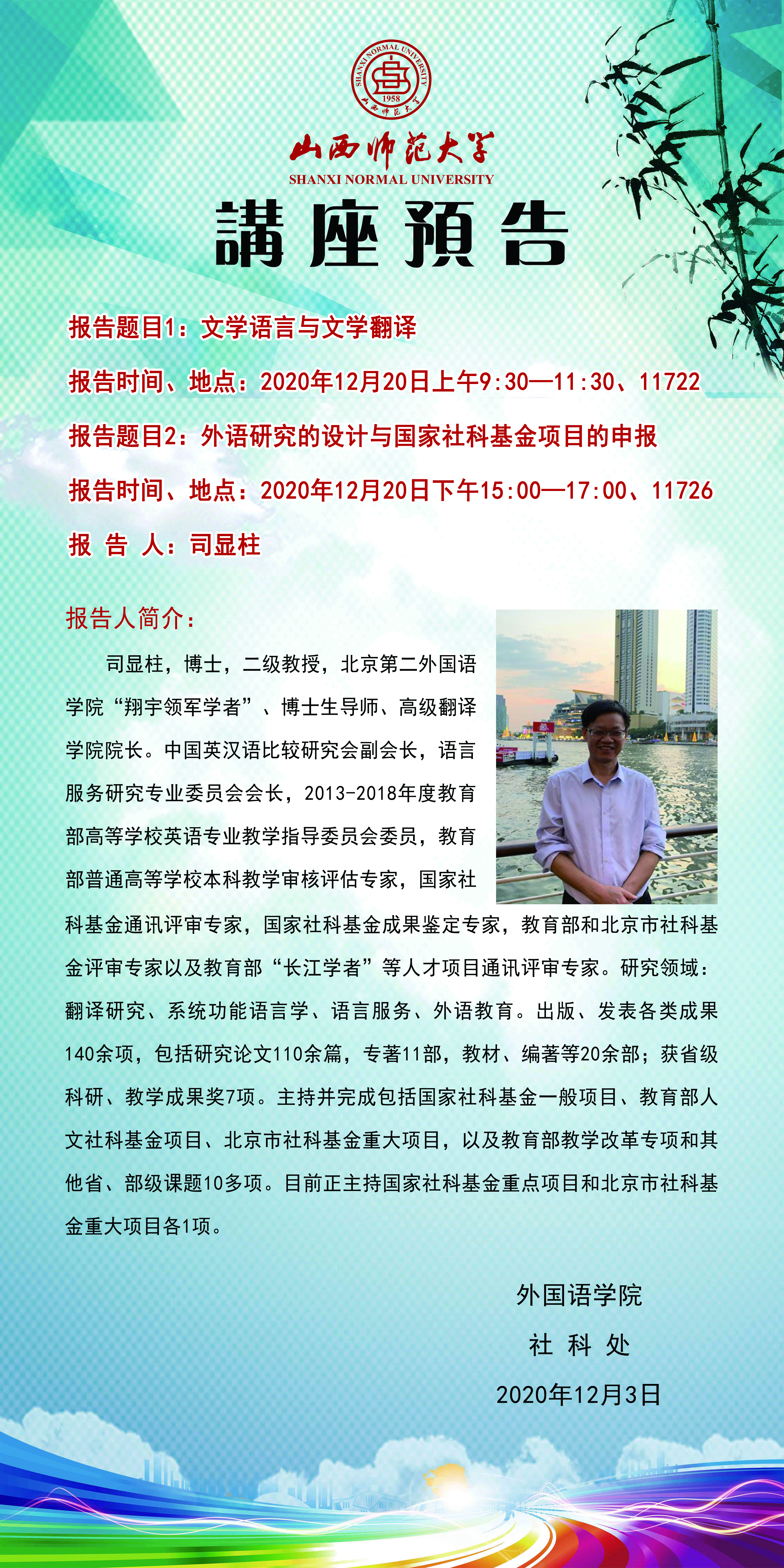 【预告】北京第二外国语学院博士生导师、高级翻译学院院长司显柱教授应外国语学院邀请来威尼斯官网作学术报告