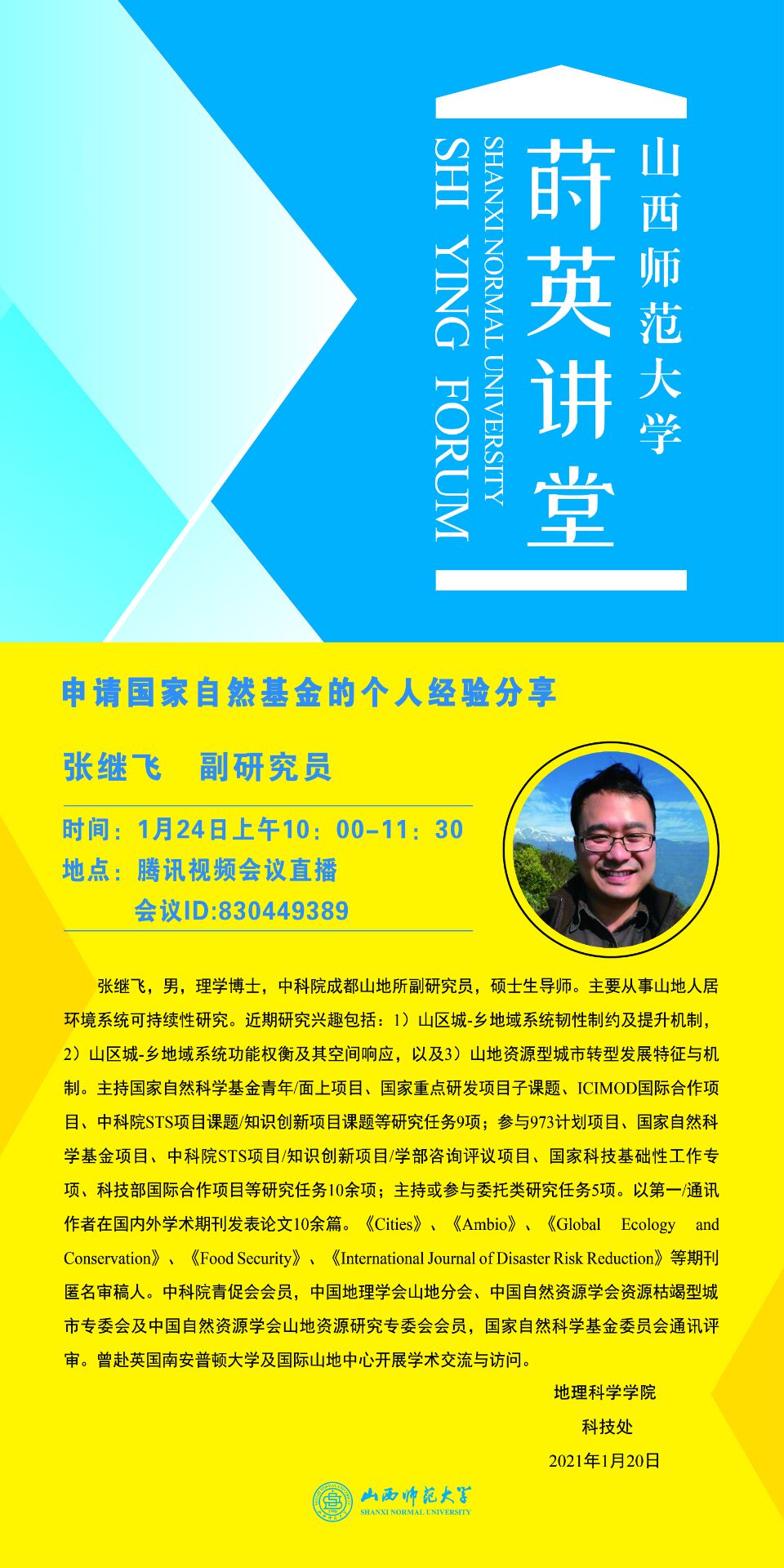 【预告】中科院成都山地所张继飞副研究员应威尼斯官网邀请作学术报告