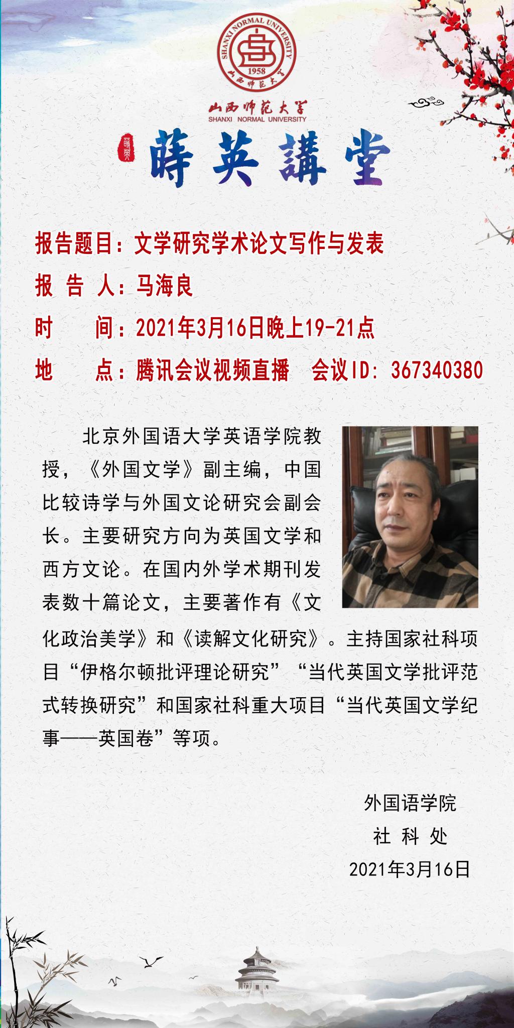 【预告】【莳英讲堂】北京外国语大学马海良教授应外国语学院邀请作线上学术报告