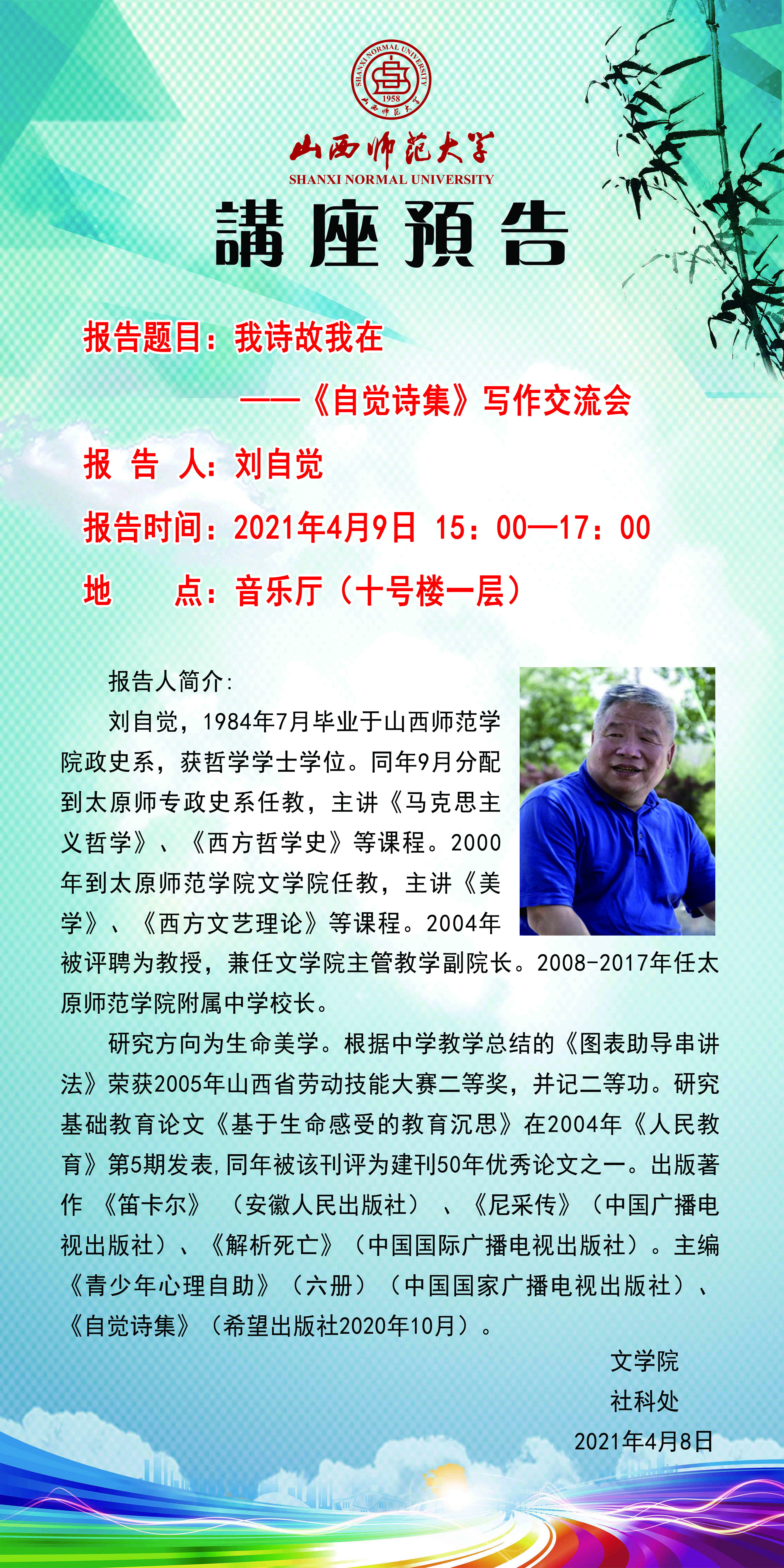 【预告】太原师范学院附属中学校长刘自觉教授应文学院邀请来威尼斯官网作学术报告