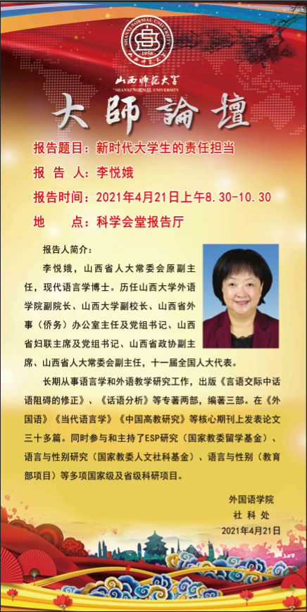 【预告】山西省人大常委会原副主任李悦娥教授应外国语学院邀请来威尼斯官网作学术报告