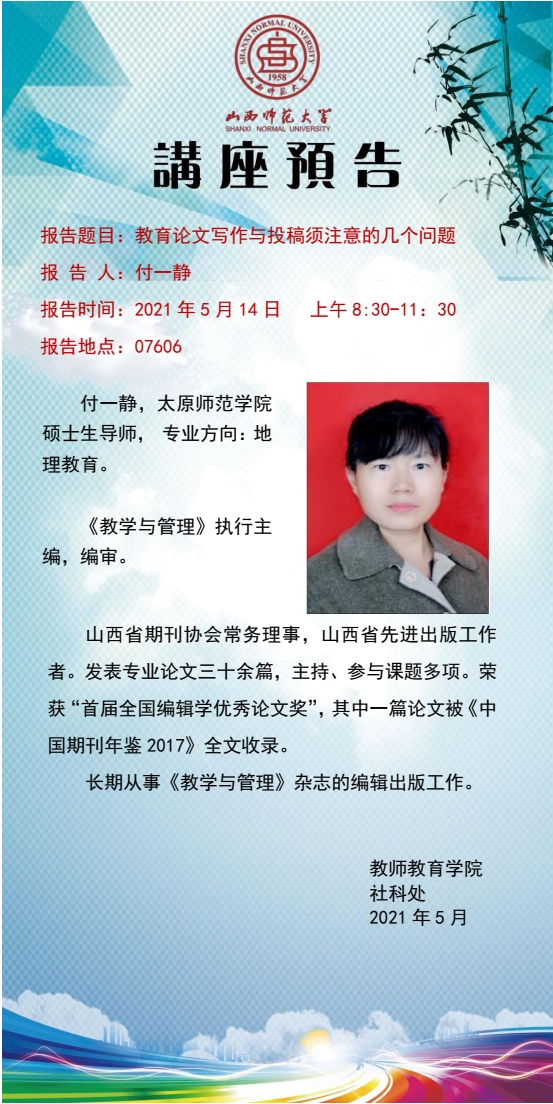 【预告】《教学与管理》杂志付一静编审应教师教育学院邀请来威尼斯官网作学术报告
