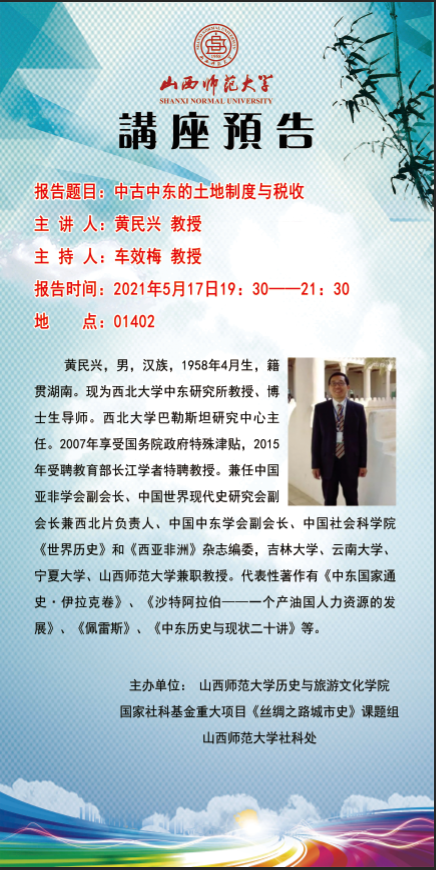 【预告】西北大学中东研究所黄民兴教授应历史与旅游文化学院邀请来威尼斯官网作学术报告
