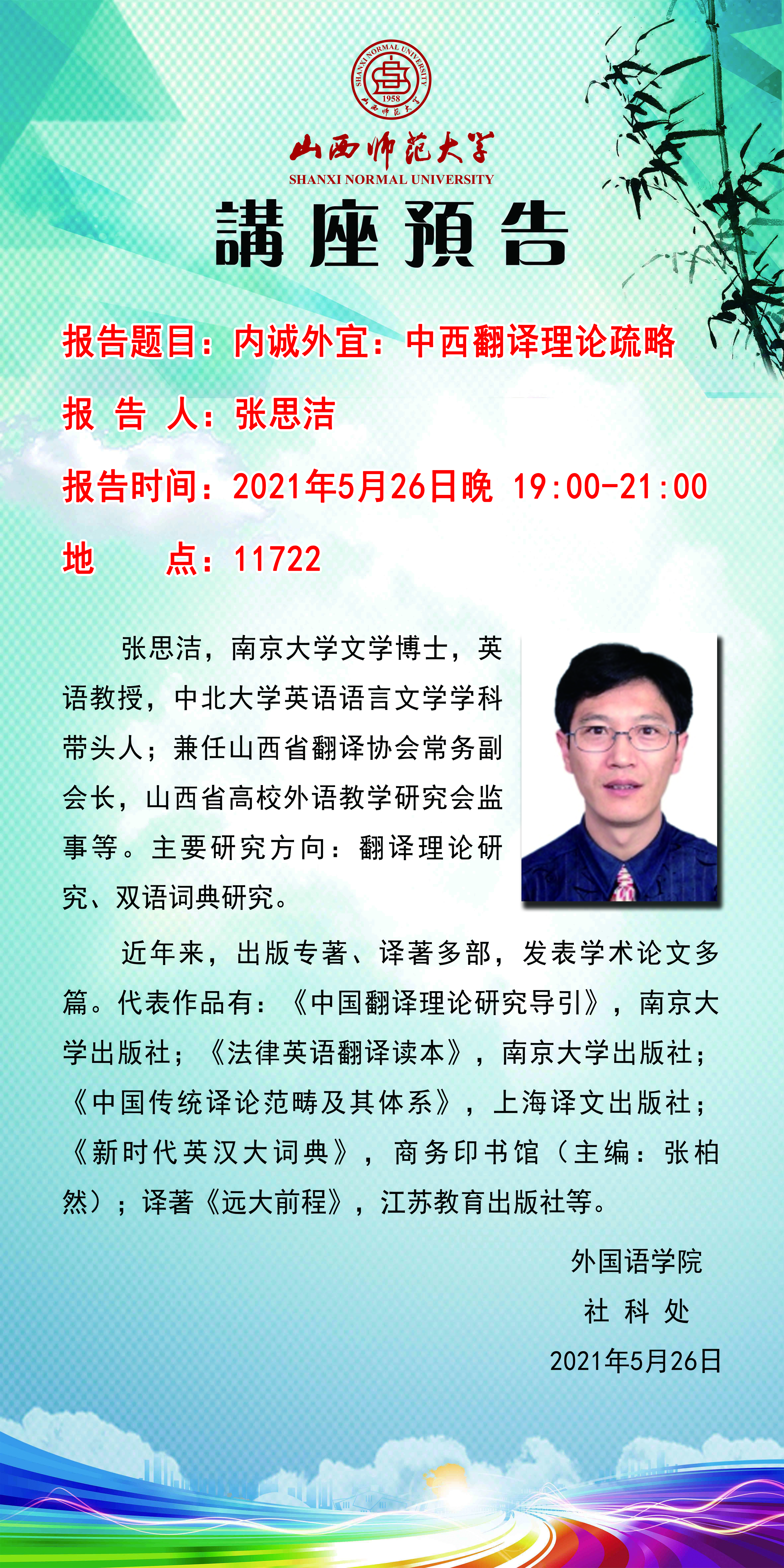 【预告】 中北大学张思洁教授应外国语学院邀请来威尼斯官网作学术报告