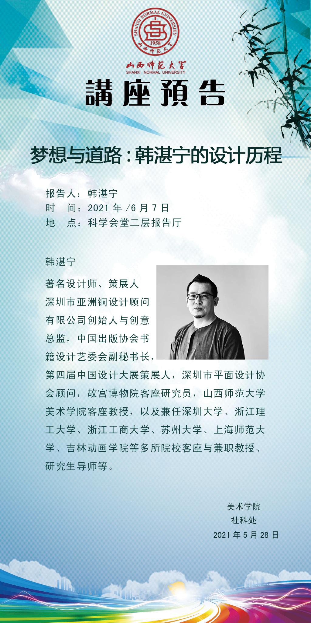 【预告】威尼斯官网杰出校友、国际著名设计师、策展人韩湛宁教授应美术学院邀请来威尼斯官网作学术报告