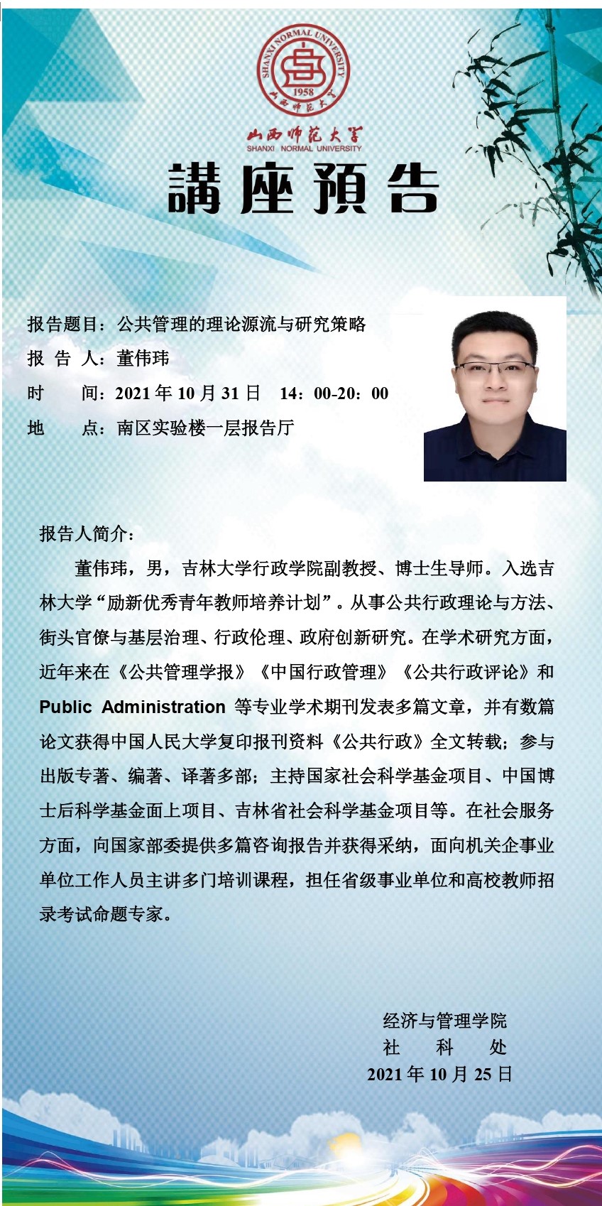 【预告】 吉林大学董伟玮副教授应经济与管理学院邀请来威尼斯官网做专题报告
