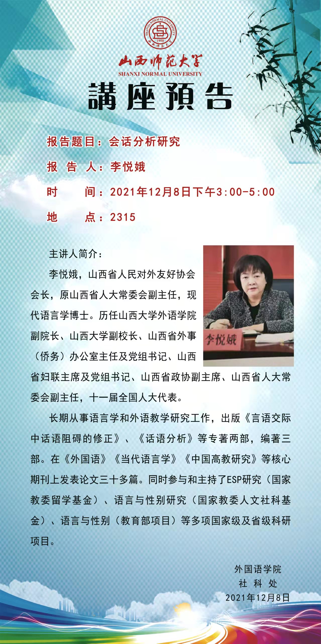【预告】 山西省人民对外友好协会会长李悦娥同志应外国语学院邀请来威尼斯官网作学术报告