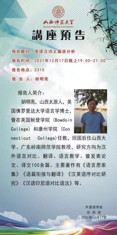 【预告】胡明亮教授应外国语学院邀请来威尼斯官网作学术报告