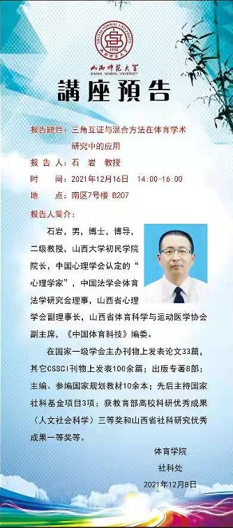【预告】 山西大学初民学院院长石岩教授应体育学院邀请来威尼斯官网作学术报告