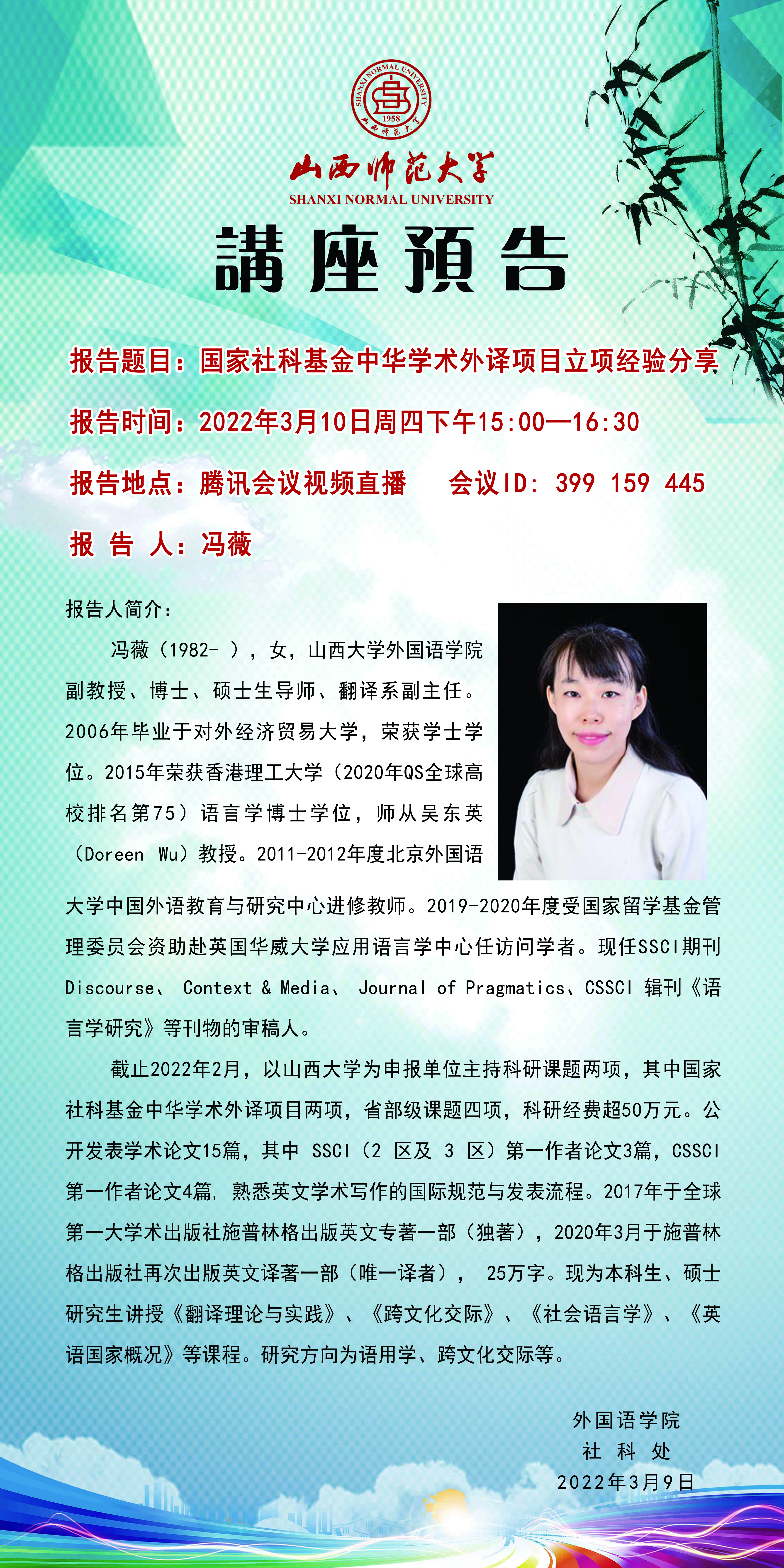 【预告】山西大学冯薇副教授应外国语学院邀请作线上学术报告
