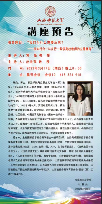 【预告】长治学院常晶教授应马克思主义学院邀请作线上学术报告