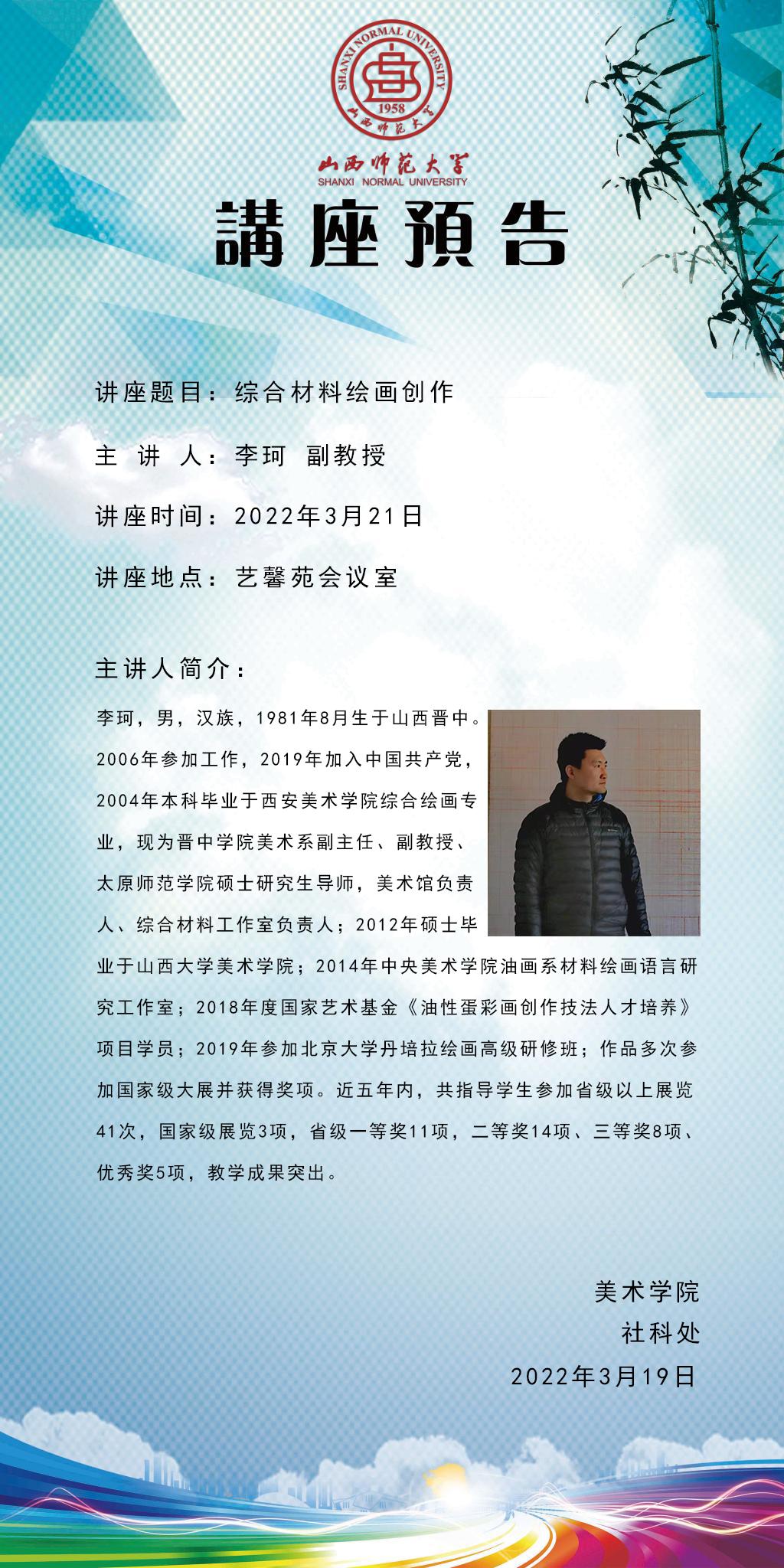 【预告】 晋中学院李珂副教授应美术学院邀请来威尼斯官网作学术报告