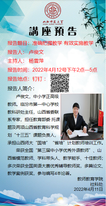 【预告】临汾市第一中心学校教科研处卢俊文主任应教师教育学院邀请作线上学术报告
