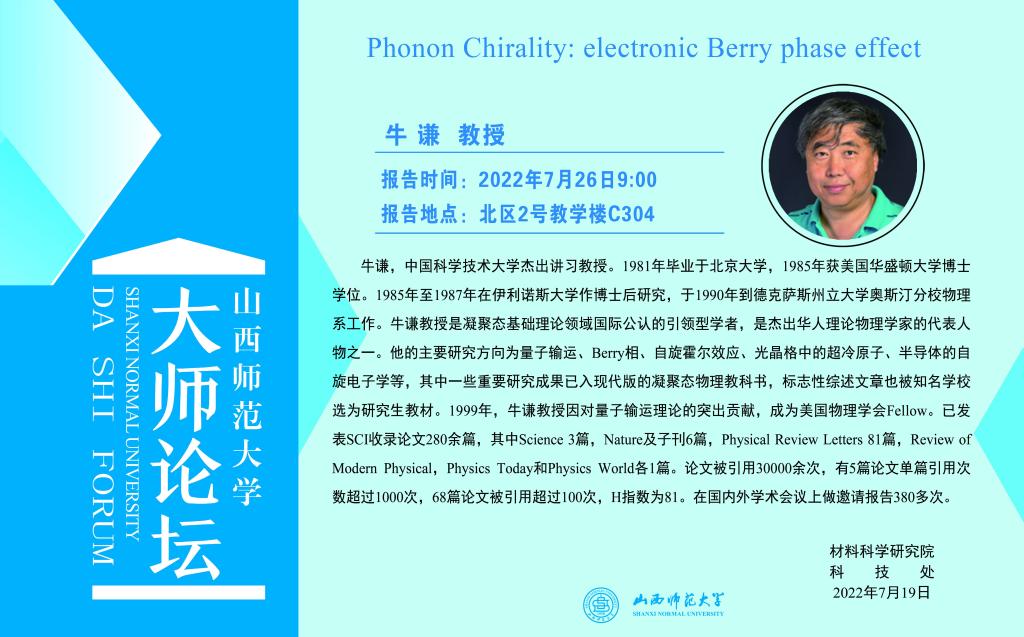 【预告】大师论坛-中国科学技术大学牛谦教授应威尼斯官网邀请作学术报告