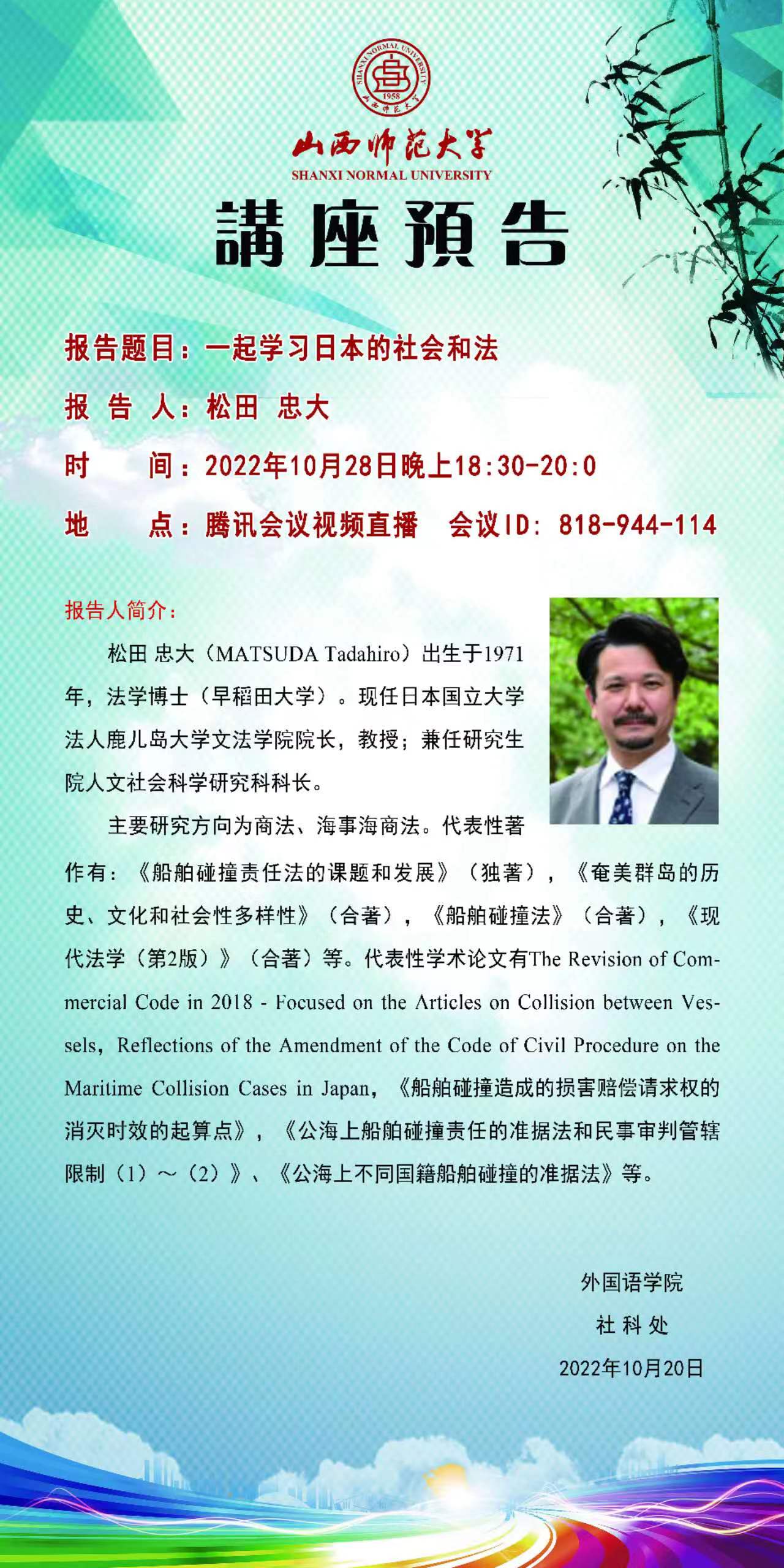 【预告】日本国立大学法人鹿儿岛大学松田忠大教授应威尼斯官网邀请做线上学术报告