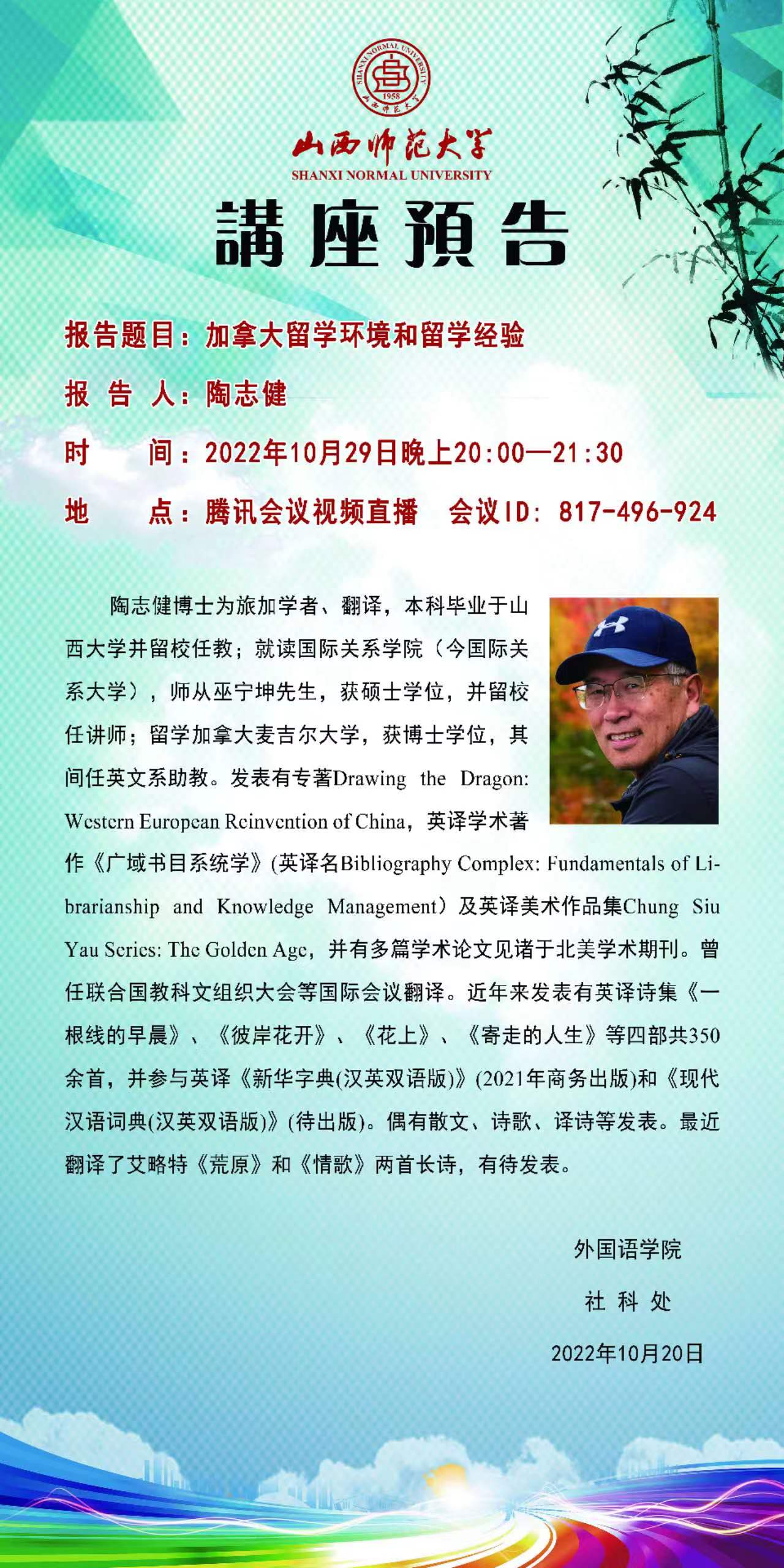 【预告】旅加学者陶志健博士应威尼斯官网邀请做线上学术报告