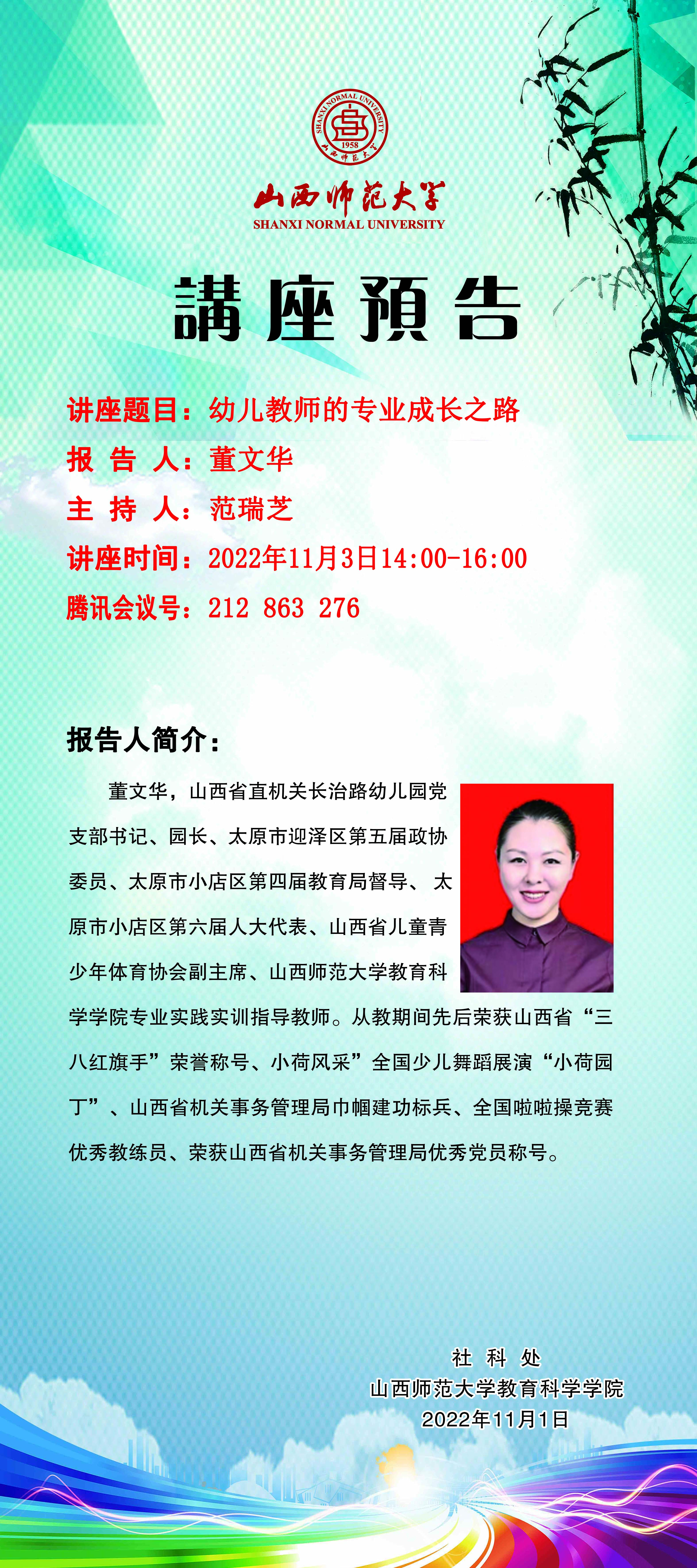 【预告】山西省直机关长治路幼儿园园长董文华应教育科学学院邀请作学术报告