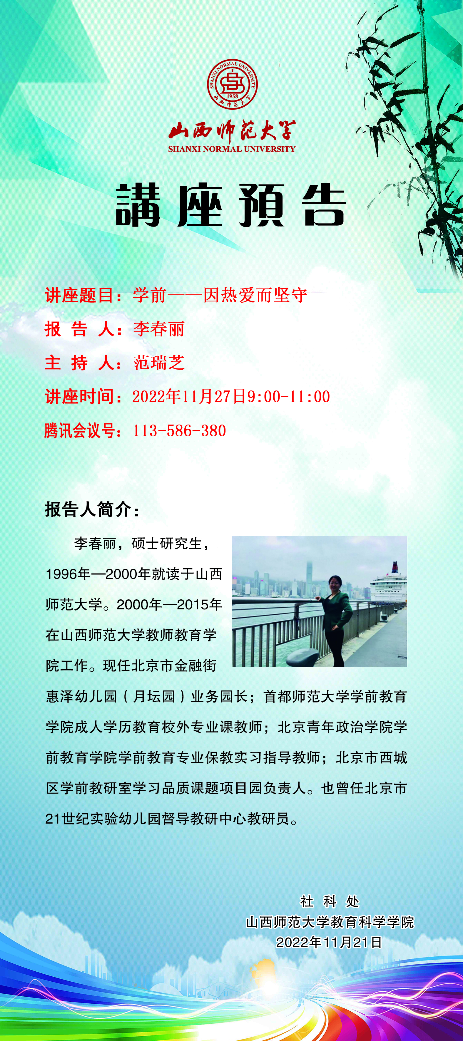 【预告】北京金融街惠泽幼儿园业务园长李春丽应威尼斯官网邀请作学术报告