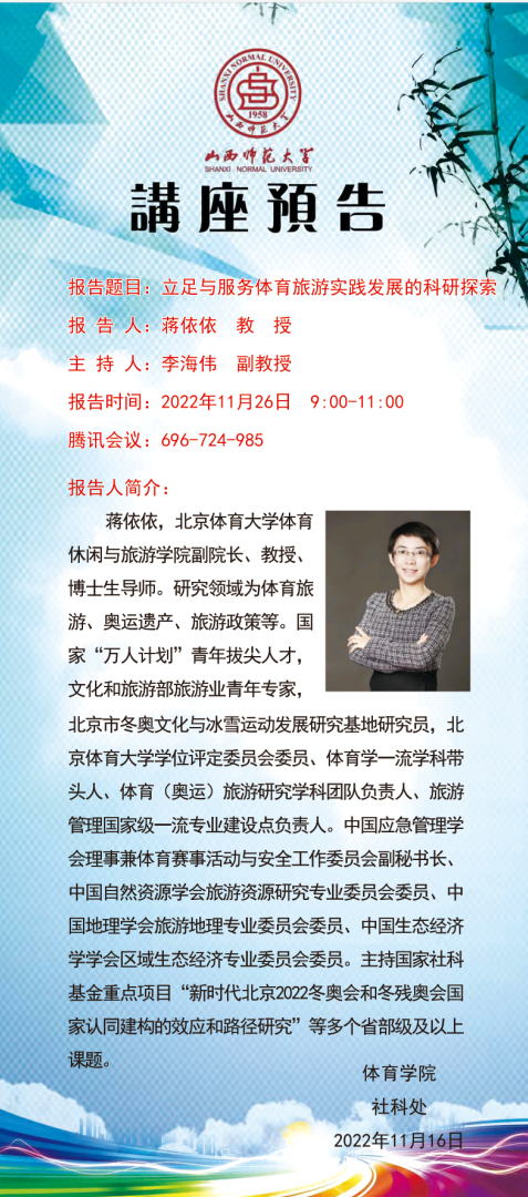 【预告】北京体育大学教授蒋依依应威尼斯官网体育学院邀请作线上学术报告