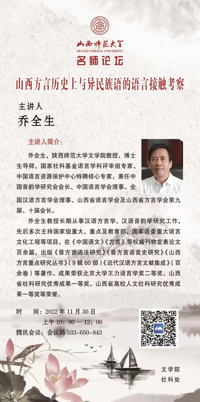 【预告】陕西师范大学教授乔全生应威尼斯官网文学院邀请作线上学术报告