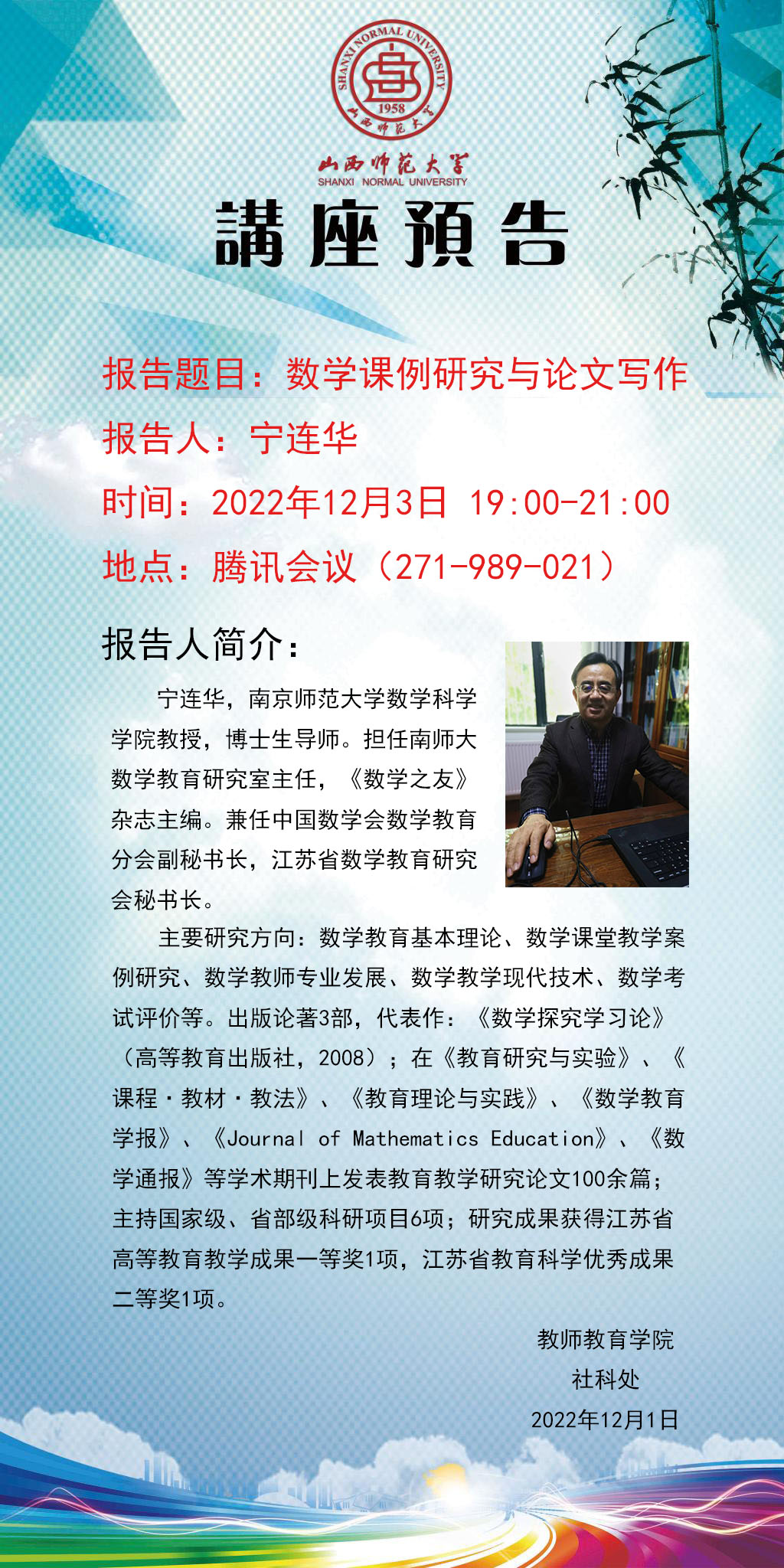【预告】南京师范大学教授宁连华应威尼斯官网教师教育学院邀请作线上学术报告