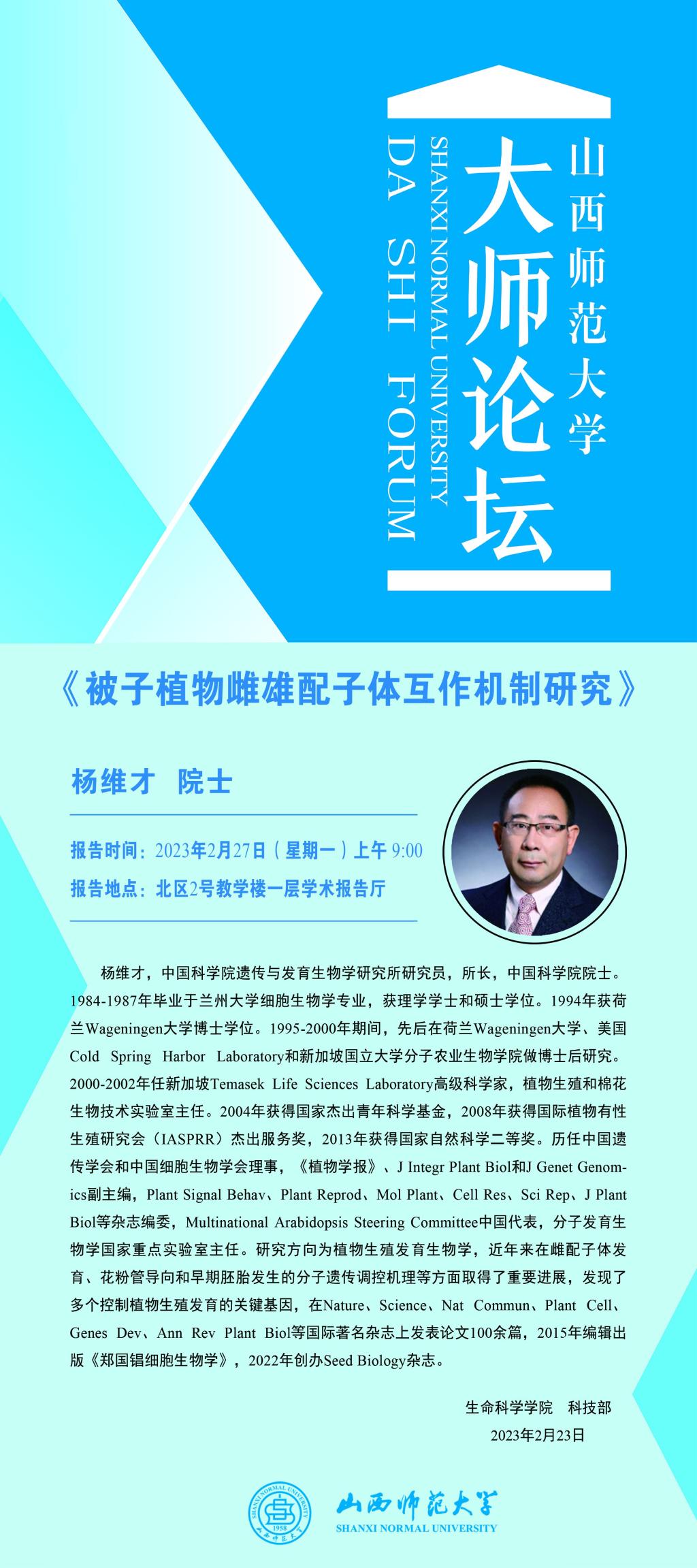 【大师论坛】中国科学院遗传与发育生物学研究所杨维才院士应威尼斯官网邀请作学术报告