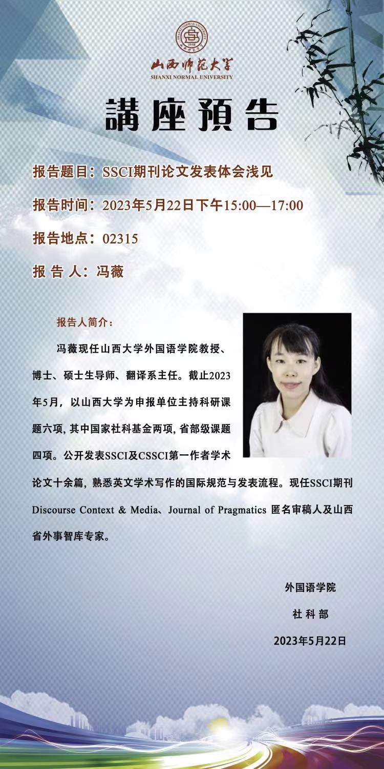 【预告】山西大学冯薇教授应外国语学院邀请作学术报告