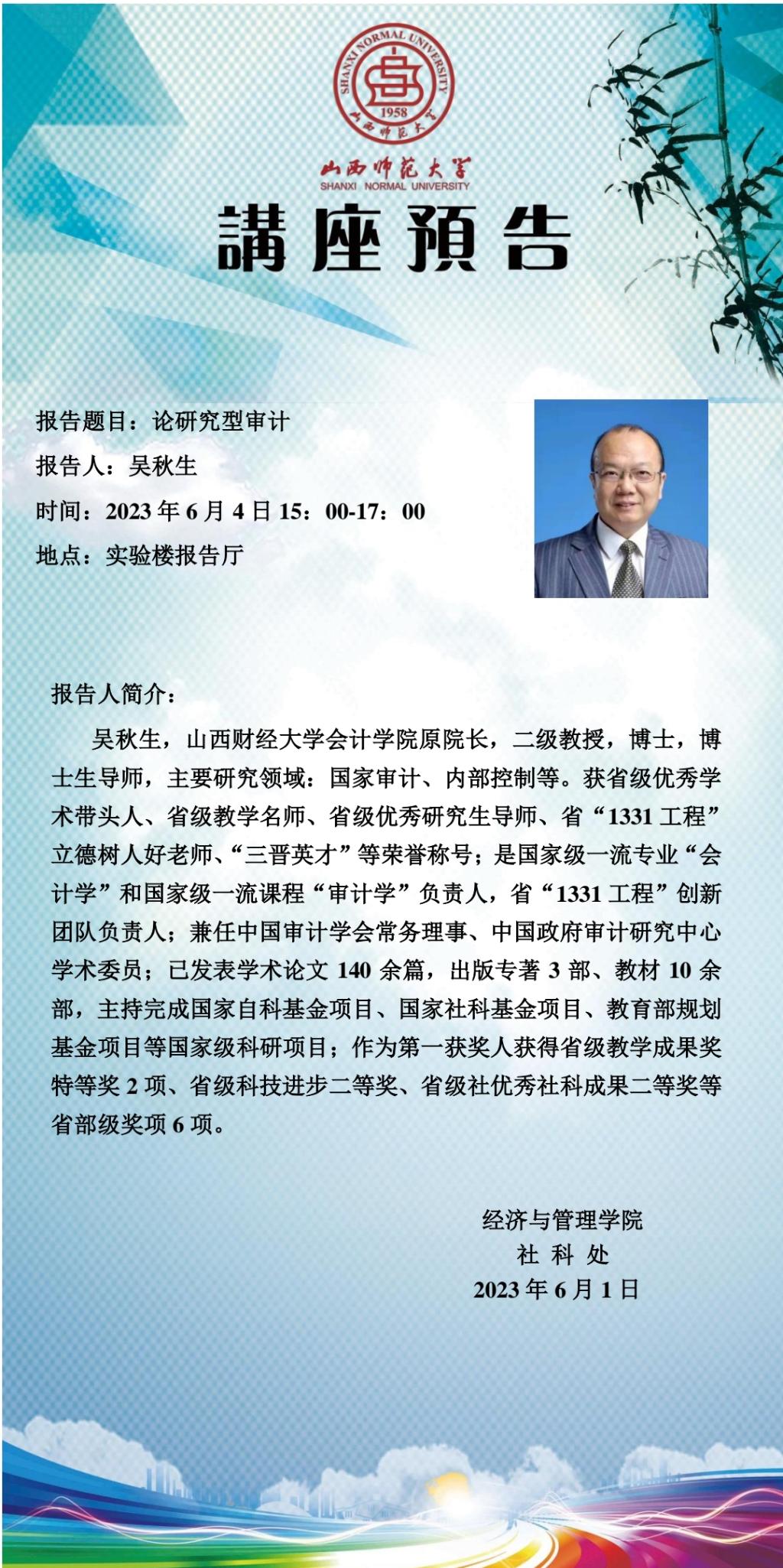 【预告】山西财经大学吴秋生教授应威尼斯官网经济与管理学院邀请作学术报告