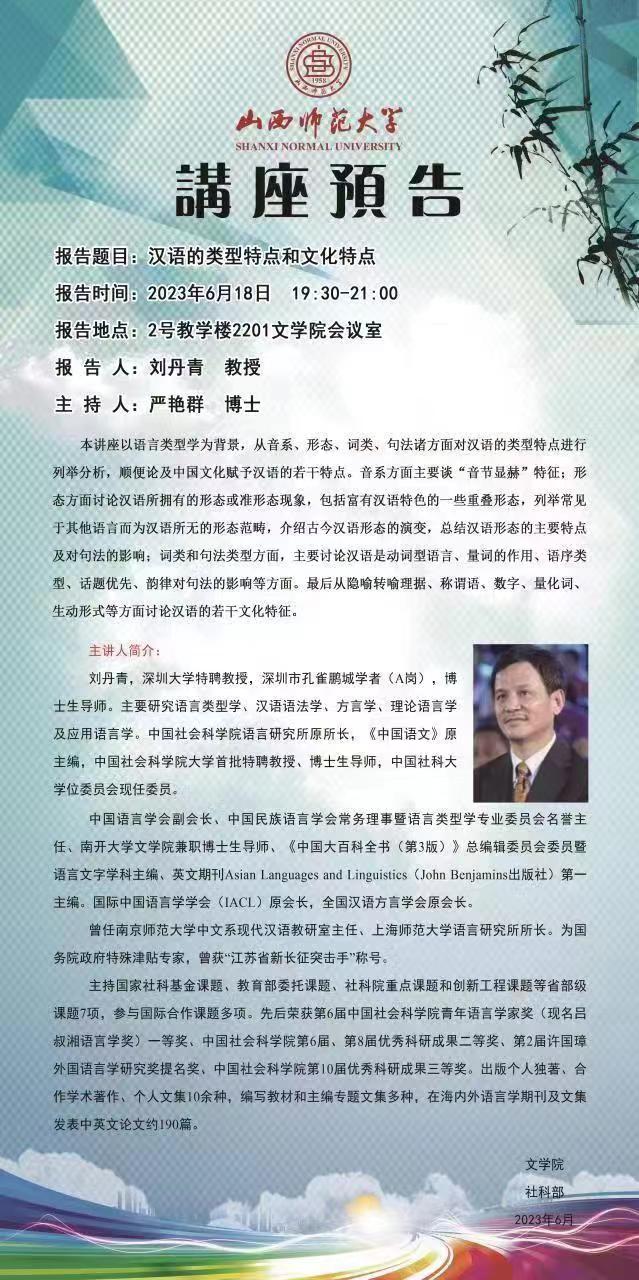 【预告】深圳大学刘丹青教授应文学院邀请作学术报告