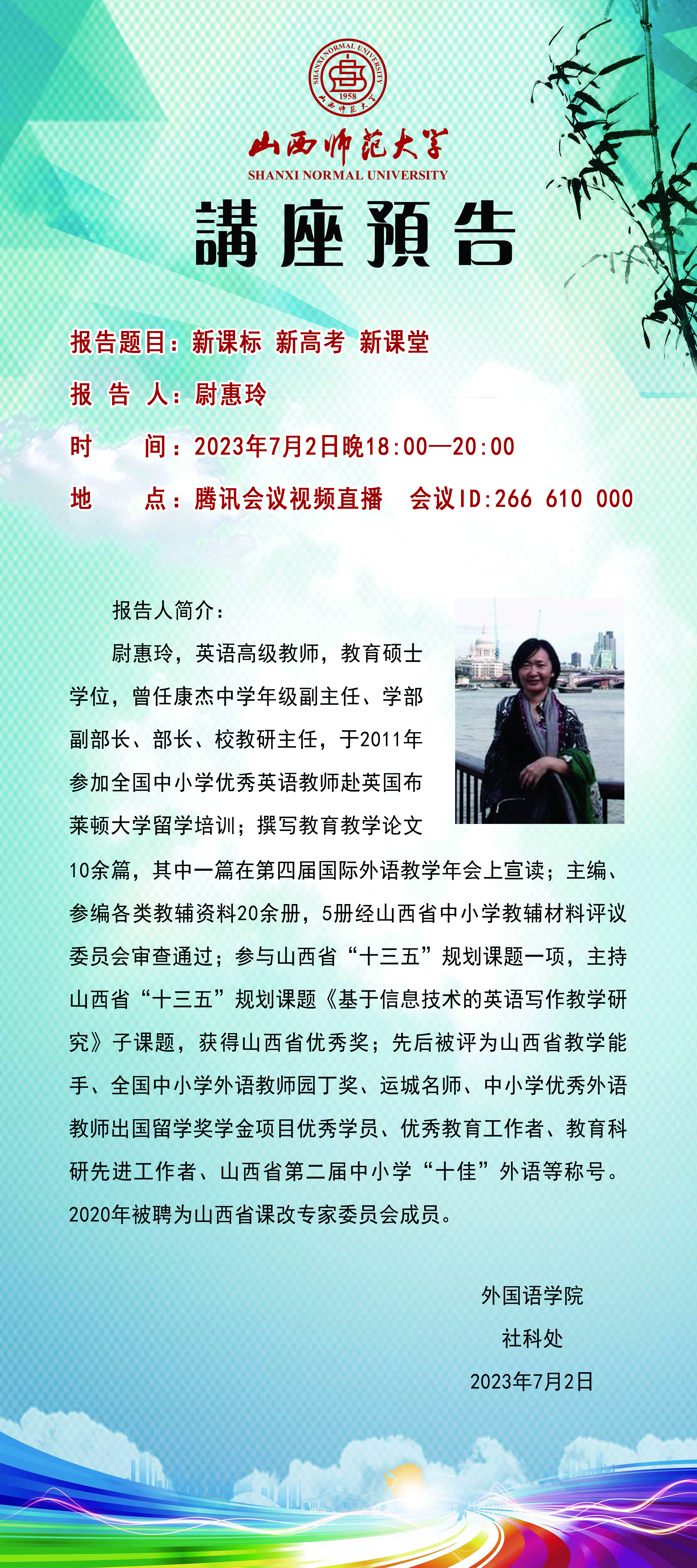 【预告】运城市新康学校教科研中心主任尉惠玲老师应外国语学院邀请做学术报告
