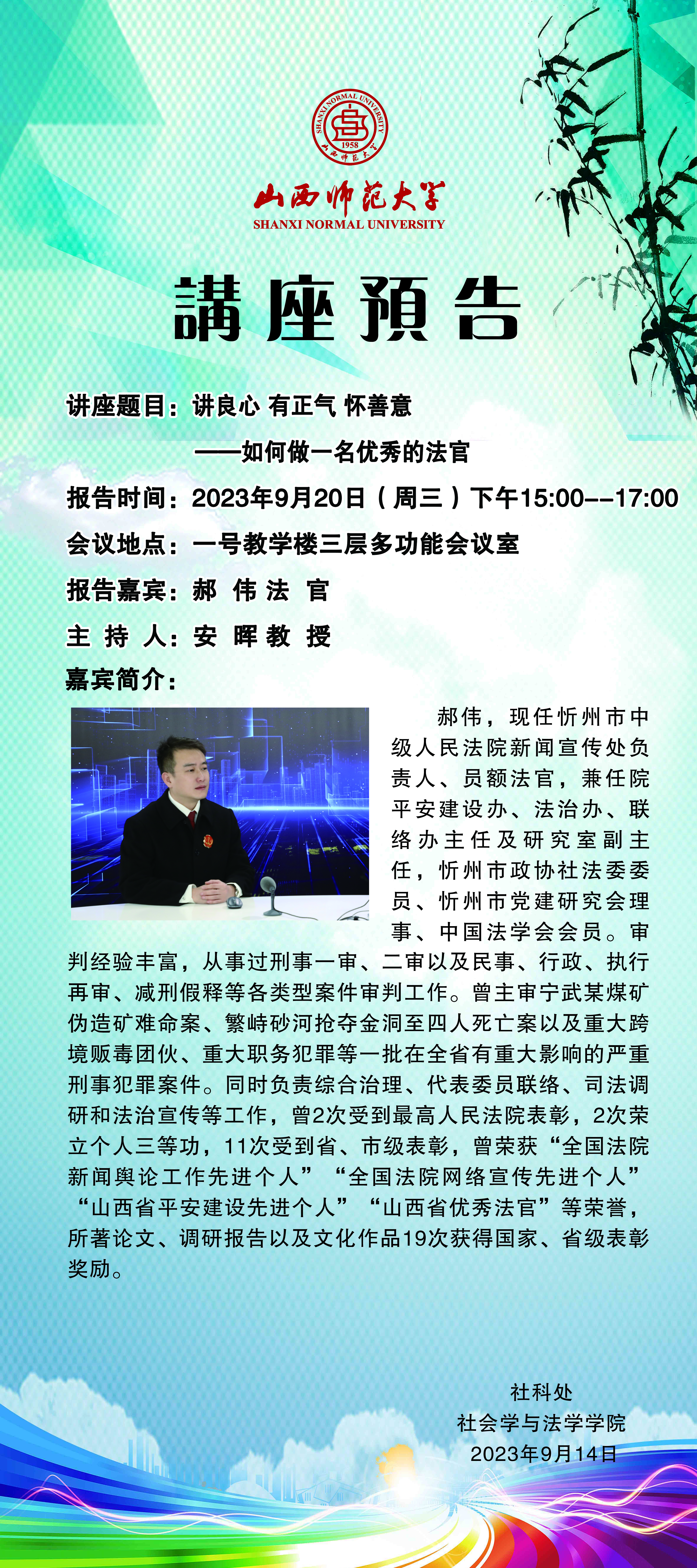 【预告】山西省忻州市中级人民法院新闻宣传处郝伟法官受社会学与法学学院邀请作学术报告