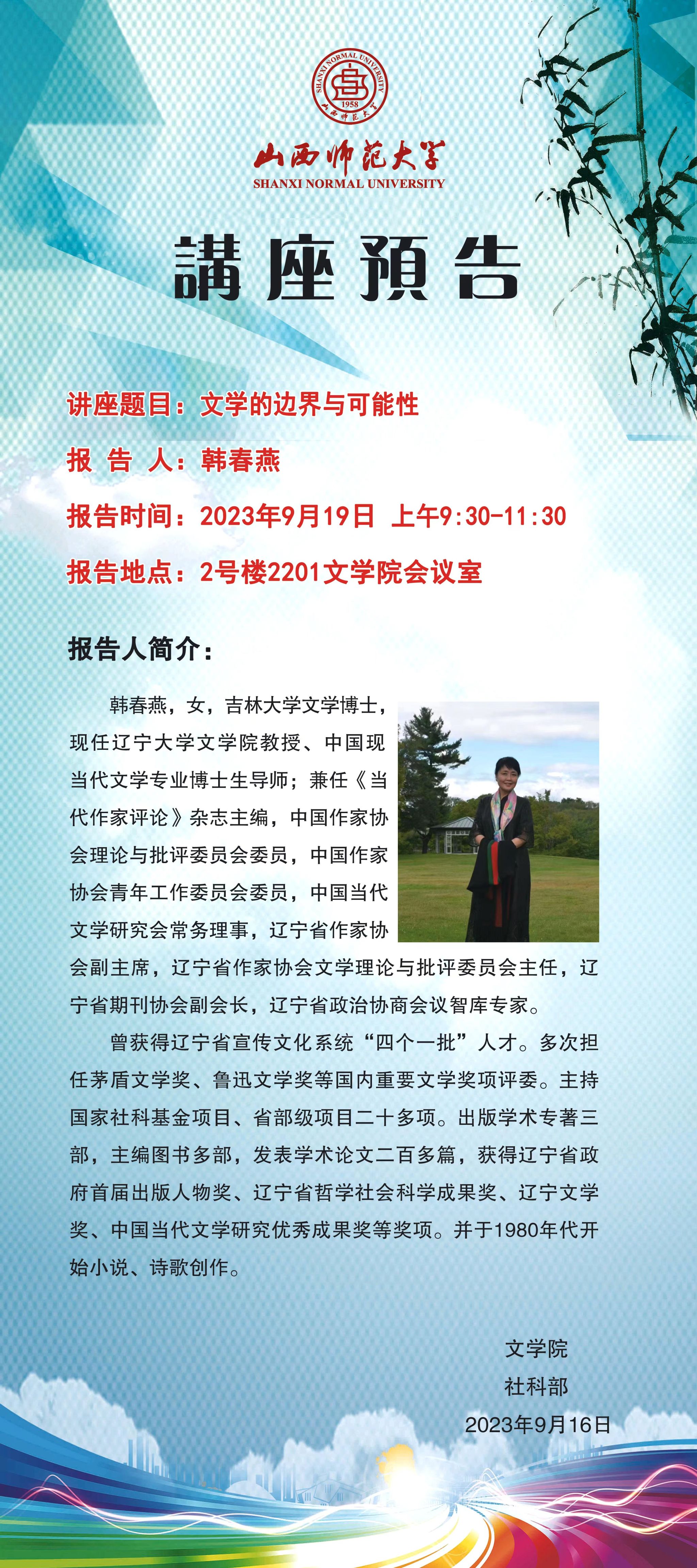 【预告】辽宁大学文学院教授韩春燕应威尼斯官网文学院邀请作学术报告