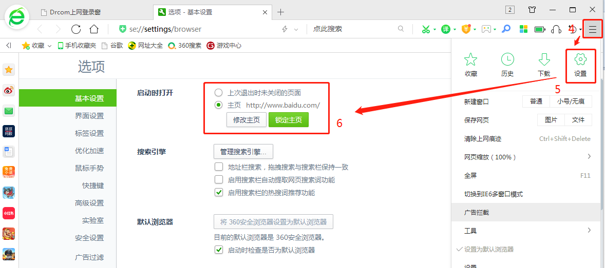 打开360安全浏览器→ 设置 → 基本设置 → 修改主页(例如:http://www.baidu.com,不使用360做主页即可),修改完成后下次启动会快速进入认证页面。
