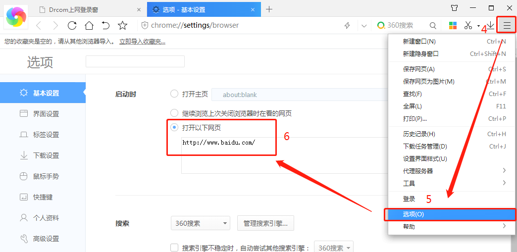 打开360极速浏览器→设置 →选项 →选择打开以下网页(例如:http://www.baidu.com,不使用360做主页即可),修改完成后下次启动会快速进入认证页面。