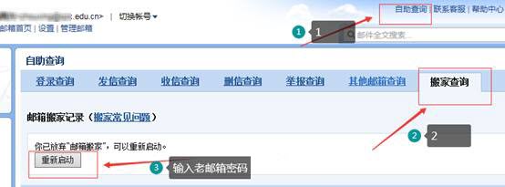 2.若此次放弃邮箱搬家后面又想重新做时,只需电脑登录邮箱,在页面右上角找到“自助查询”-“搬家服务”,点击“重新启动”后输入原邮箱密码即可。