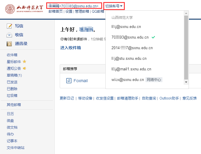 登录后默认邮箱账号为新工号/学号@sxnu.edu.cn,这是邮箱的主账号,其他个人邮箱账号都是它的别名,可通过页面左上角的“切换账号”,选择需要的发信账号。