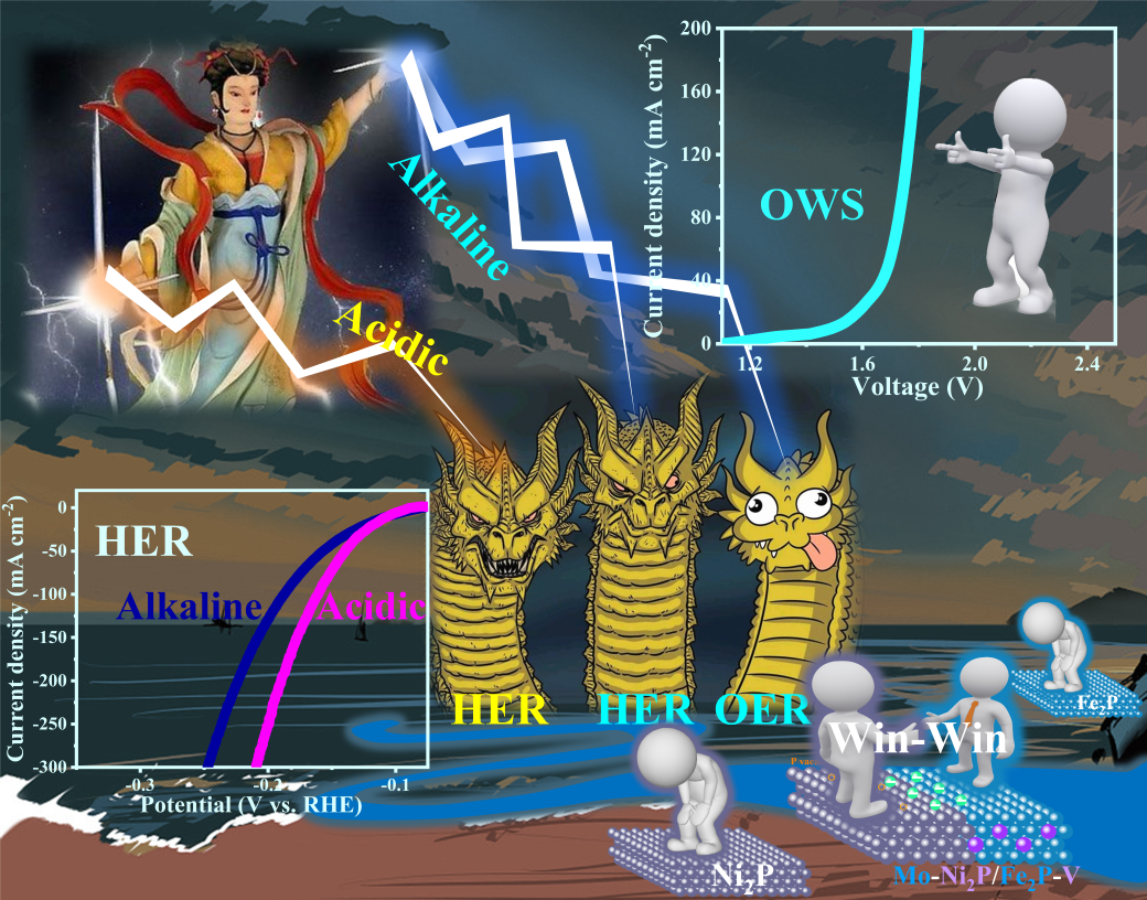 随着能源危机和全球变暖问题的日益严重,寻找可持续且清洁的替代能源已迫在眉睫。绿色氢气作为一种可再生的能源载体,因其高能量密度和环境友好的燃烧产物而备受关注。电催化水裂解制氢是可再生能源领域一种重要的制氢方法,被认为是最实用、最经济的方法,具有广阔的应用前景。然而,受限于两个半反应过程中较高的过电势。因此,在电催化水裂解过程中,开发高效稳定的过渡金属基双功能电催化剂仍然是一项艰巨的挑战。基于普鲁士蓝和三氧化二铁副产物,在泡沫镍铁上成功构筑了具备P缺陷的Mo掺杂Ni2P/FexP多异质结构电催化剂(Mo-Ni2P/FexP-V/NFF)。归因于原子掺杂、异质界面工程以及P缺陷等多种策略的协同作用,该催化剂在双pH环境下表现出优异的析氢活性及稳定性,而且在碱性环境下也表现出卓越的全解水性能。