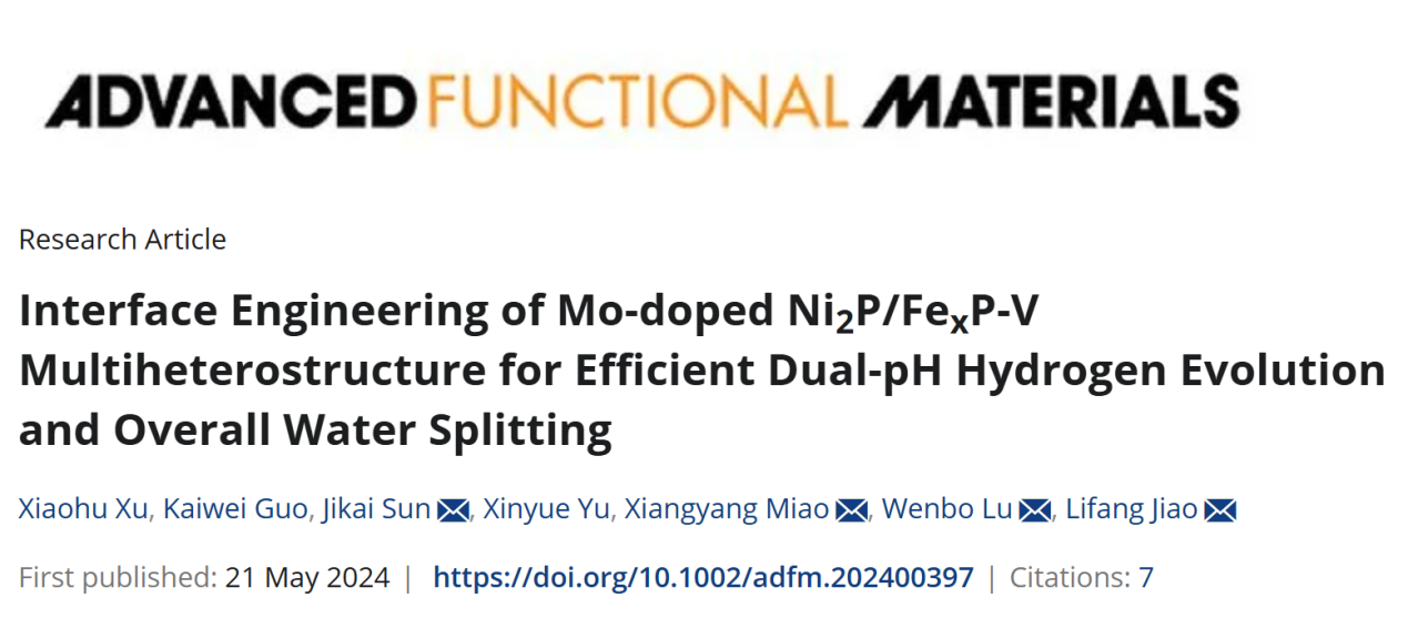 近日,威尼斯官网物信学院苗向阳教授、徐小虎教授,化材学院卢文卜教授与南开大学焦丽芳教授合作,报道了利用界面工程、掺杂和空缺等多项策略,设计开发了一种高效稳定的双pH电解水催化剂。研究成果以“Interface Engineering of Mo-doped Ni2P/FexP-V Multiheterostructure for Efficient Dual-pH Hydrogen Evolution and Overall Water Splitting”为题发表在国际顶级期刊《先进功能材料》(Advanced Functional Materials)(SCI一区Top期刊,影响因子:19)。徐小虎教授为第一作者,硕士研究生郭凯卫为共同第一作者,焦丽芳教授、卢文卜教授、苗向阳教授和孙吉凯博士为该论文的共同通讯作者,威尼斯官网为第一完成单位。该研究得到了国家自然科学基金、山西省应用基础研究计划和山西省研究生教育创新项目的支持。