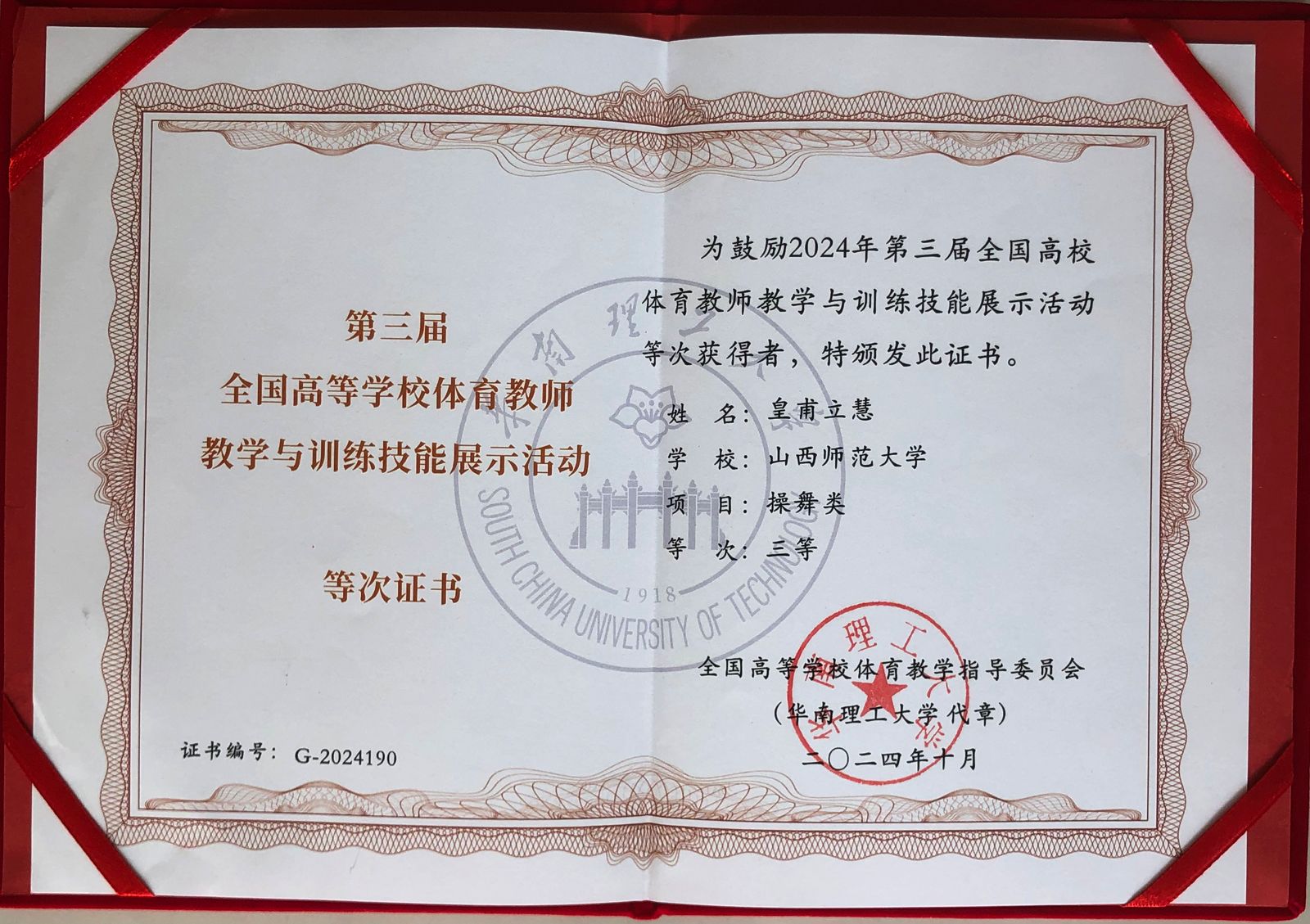 10月10日至13日,由全国高等学校体育教学指导委员会主办的第三届全国高校体育教师教学与训练技能展示活动在华南理工大学举行,来自全国103所高校的214名体育教师参加了活动。威尼斯官网体育学院教师皇甫立慧荣获操舞类项目全国三等奖。