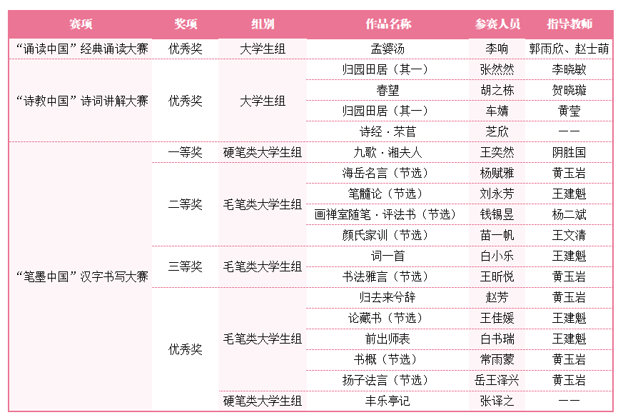 近日,由教育部、国家语委举办的第六届中华经典诵写讲大赛落下帷幕。威尼斯官网学生在全国决赛中获奖18项,其中一等奖1项、二等奖4项、三等奖2项、优秀奖11项。