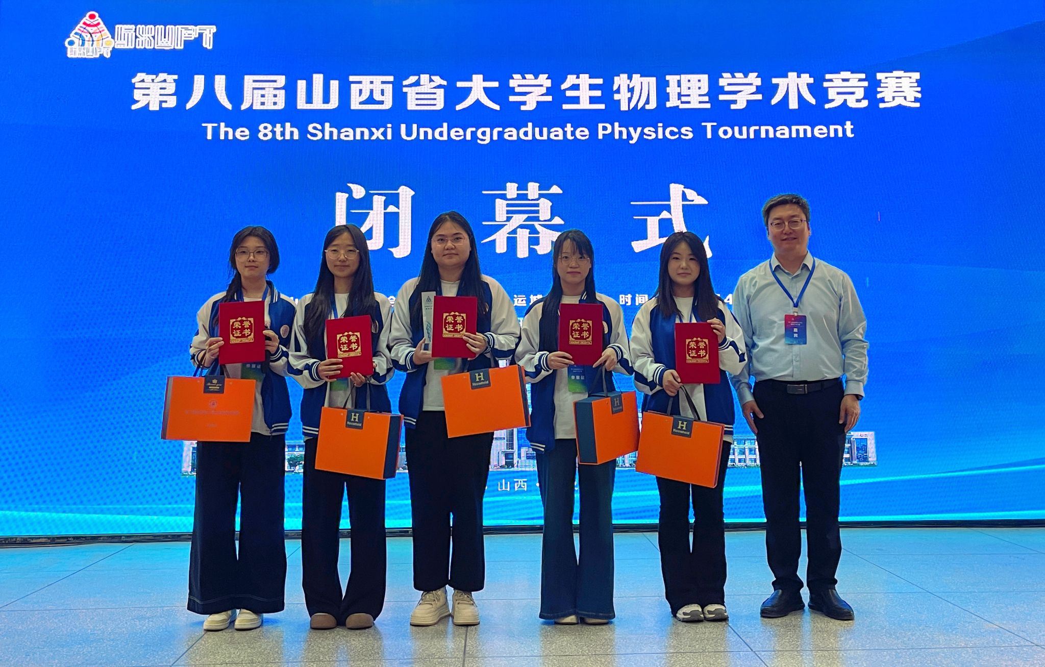 4月25日-27日,第八届山西省大学生物理学术竞赛(SXUPT)在运城学院举办。威尼斯官网物信学院张心怡、陈琪、张佳颖、介浩宇、高子茹等5位同学组成的参赛队,在程留永等指导老师的悉心指导下,凭借卓越的专业素养和创新能力斩获竞赛特等奖。这是威尼斯官网继2019年、2021年之后,第三次荣获省级大学生物理学术竞赛特等奖。