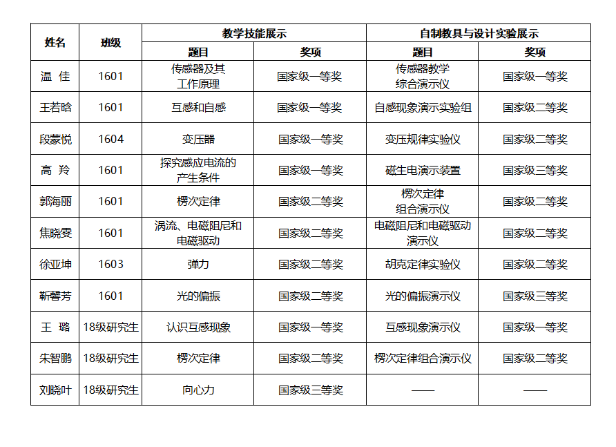 物信学院历来高度重视此项赛事,每年都会制定详细的参赛计划、进行严格的人员选拔、开展高效的集中培训。今年3月起进行了广泛动员,5—6月各班初选,6月份开展了高标准、高强度、高质量的选拔。暑假期间,组织参赛学生进行了为期20天的封闭式集中强化训练,从教学设计、课件制作、说课、讲课、教具制作等方面对参赛学生进行了全面系统的指导。赛场上,选手们沉着冷静、敢打敢拼,以扎实的课堂教学基本功、创新的实验设计、精致的自制教具以及良好的精神风貌,在高手如林的比赛中脱颖而出,给在场的专家、评委留下了深刻印象,为学院、学校赢得了荣誉。