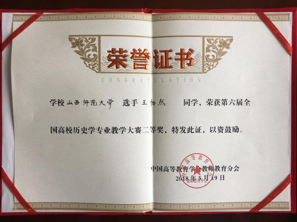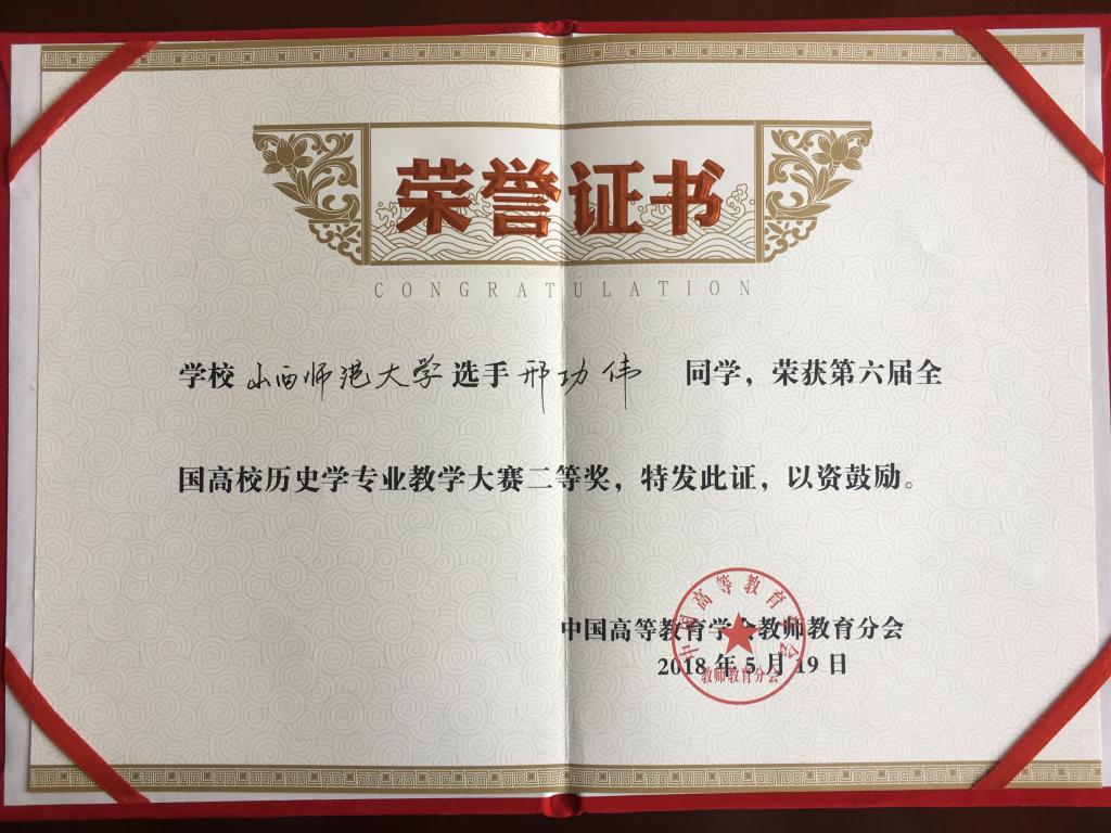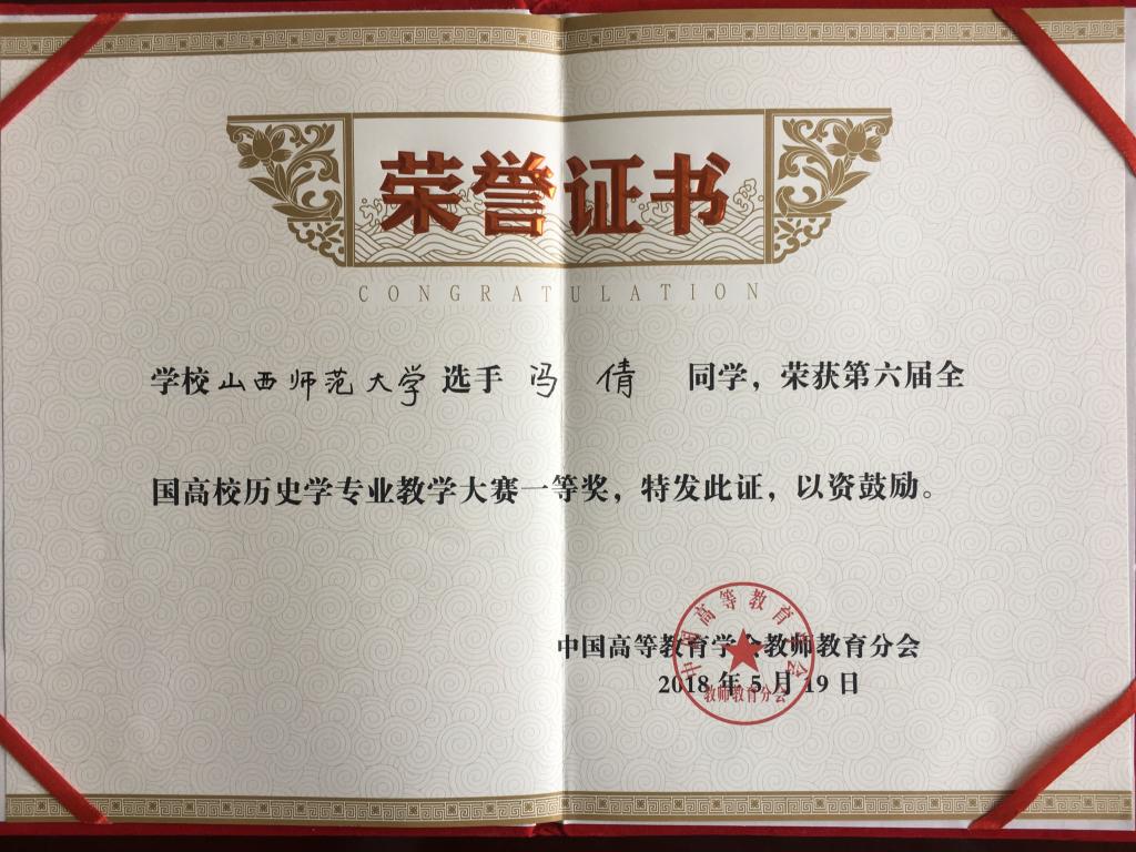 5月16日—5月20日,由全国历史教师教育专业委员会主办的第六届全国高等师范院校历史教育专业本科生教学技能大赛在云南师范大学举行,来自全国各地97所高校的291名选手参赛。历史学院选派的3位选手喜获佳绩,其中冯倩同学获得说课组一等奖、邢功伟同学获得说课组二等奖、王怡然同学获得讲课组二等奖;侯洪梅老师获得优秀指导老师。