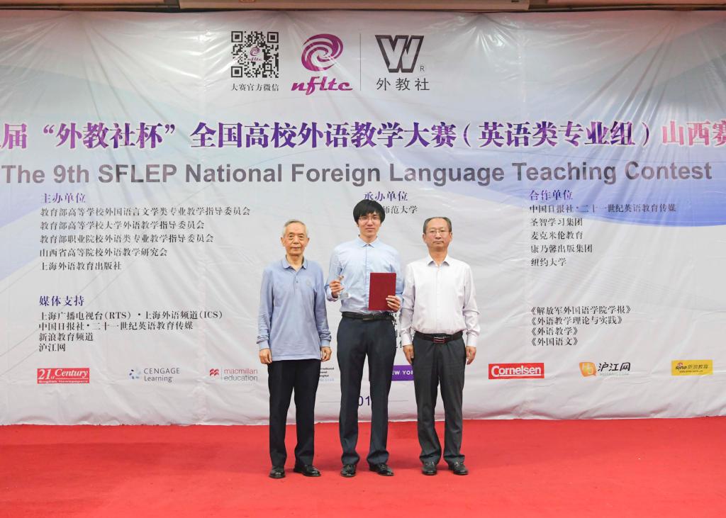 山西省人民政府外事侨务办公室副主任秦杰、上海外语教育出版社副总编辑张宏为英语专业组特等奖选手颁奖
