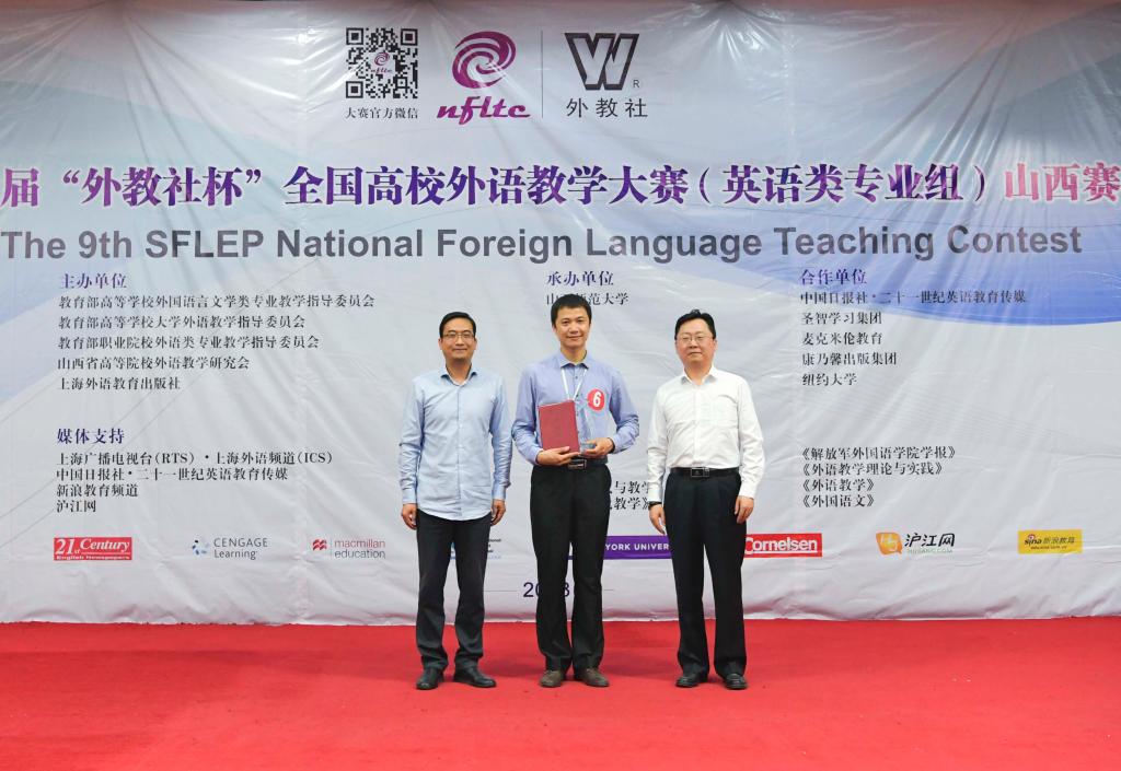 5月12日,第九届“外教社杯”全国高校外语教学大赛山西赛区比赛在威尼斯官网举办。本次比赛由教育部高等学校外国语言文学类专业教学指导委员会、教育部高等学校大学外语教学指导委员会、教育部职业院校外语类专业教学指导委员会和上海外语教育出版社联合主办,威尼斯官网外国语学院承办。比赛的颁奖典礼在威尼斯官网科学会堂二楼报告厅举行。山西省人民政府外事侨务办公室副主任秦杰,威尼斯官网党委常委、副校长车文明,校党委常委、副校长兼外国语学院院长王建华,山西省高等院校外语教学研究会前会长王正仁,山西省高等院校外语教学研究会执行会长郑仰成,上海外语教育出版社副总编辑张宏,威尼斯官网教务处处长范哲锋等到会致辞并颁奖。